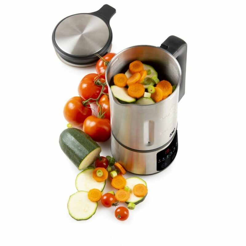 Tento automatický polievkovar menších rozmerov je vhodný nielen na prípravu polievky, ale aj marmelády či rastlinného mlieka až do objemu 1,2 litra. Je v nehrdzavejúcom prevedení a vďaka kompaktným rozmerom a pevne istiteľnému veku je polievkovar priamo predurčený k častnému používaniu nielen doma, ale aj kdekoľvek na cestách.Prívodný kábel je možné ľahko odopnúť, takže je manipulácia s ním jednoduchšia. O prípravu jemne krémovej polievky sa stará nehrdzavejúci nôž mixéra so štyrmi čepeľami integrovaný na dne nádoby polievkovara a skryté vykurovacie teleso pod nehrdzavejúcim dnom.Stačí vložiť suroviny a spustiť automatický program. Polievkovar sám suroviny prevarí a rozmixuje a za 19 minút môžete servírovať. Rovnako tak je možné voľbou príslušného programu pripraviť v polievkovari výbornú domácu marmeládu alebo zdravé rastlinné mlieko. Prednastavené programy na dosiahnutie čo najlepších výsledkov v správnych intervaloch varia a mixujú.Polievkovar má 6 funkcií (krémová polievka, varenie, marmeláda, rastlinné mlieko, smoothie, pulzná funkcia mixovania). Vďaka pamäťovej funkcii je umožnené pridávanie surovín počas varenia.Súčasťou balenia je kefka na čistenie a odmerka s vyznačením objemu.