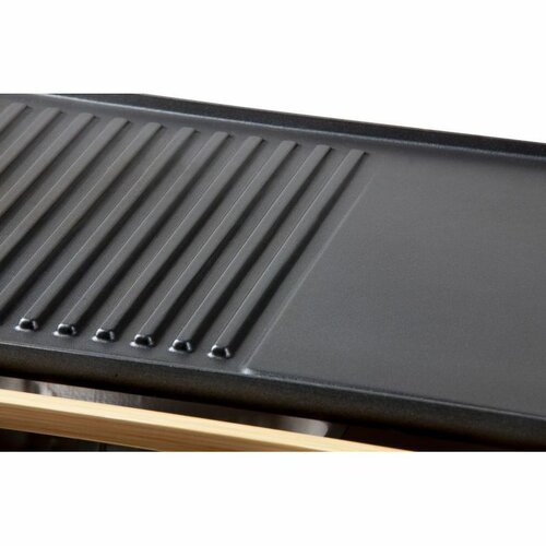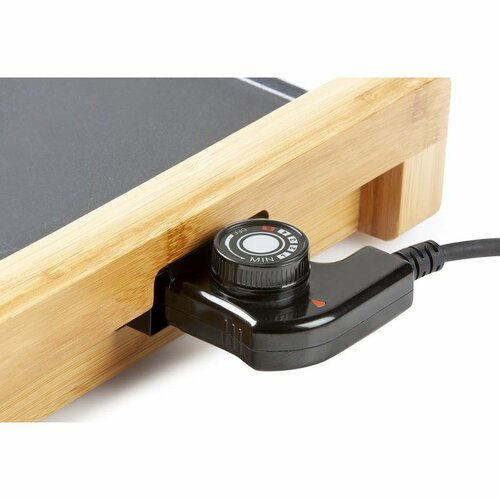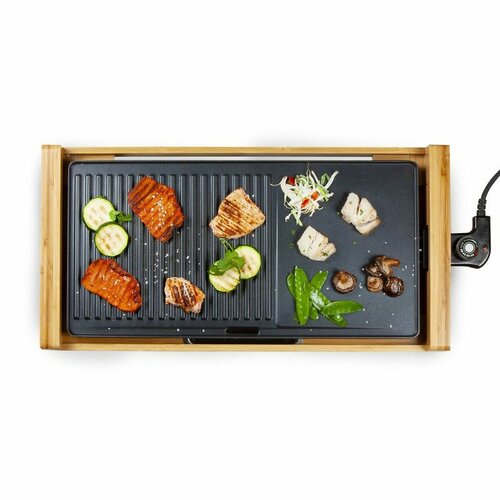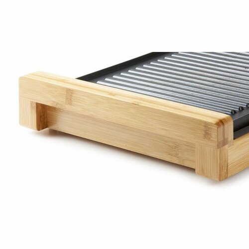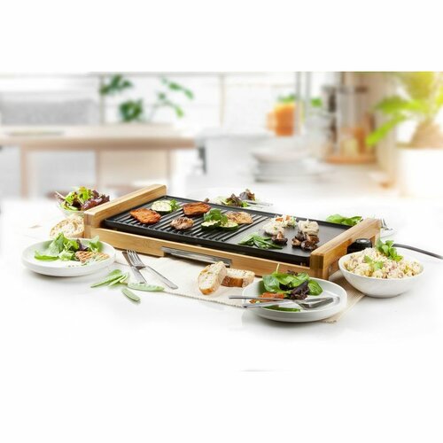Elektrický stolný gril s dizajnovýmm rámom z bambusového dreva vybavený nastaviteľným termostatom. Kombinovaná doska na pečenie s vrúbkovanou časťou pre prípravu mäsa, rýb alebo perfektne ugrilovanej zeleniny a hladká plocha pre prípravu vajec, omeliet a tiež i mäsa. Celú plochu na pečenie chráni pred pripálením nepriľnavý povrch, ktorý tiež veľmi uľahčuje čistenie a údržbu grilu.O bezpečnosť pri grilovaní sa starajú protišmykové nožičky umiestnené na spodnej časti bambusového rámu. Grilovacia časť je vybavená vlastnými gumovými nožičkami, vďaka ktorým ju možno z bambusového rámu ľahko vybrať a použiť i samostatne.Vlastnosti: