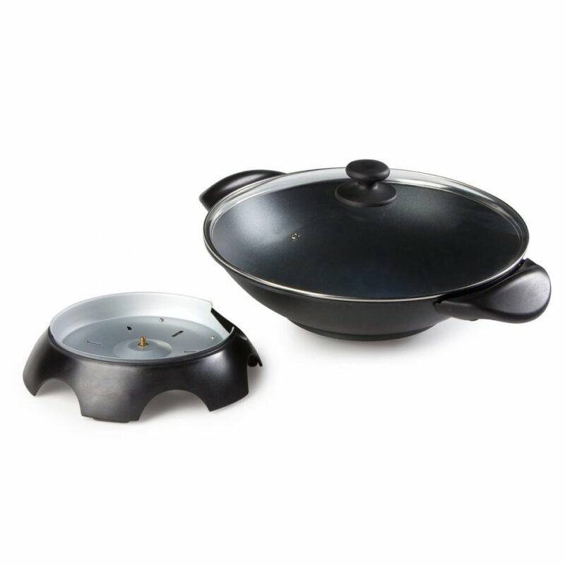 Elektrická panvica na pečenie WOK príde vhod všade tam, kde nie je k dispozícii klasický sporák, alebo máte nedostatok miesta pre klasickú WOK panvicu. Panvicu je možné ľahko prenášať, takže ju využijete aj na varenie vonku s priateľmi, alebo si ju ľahko vezmete na chatu či chalupu.Vysoký príkon elektrickej WOK panvice umožňuje jej rýchle nahriatie na požadovanú teplotu, ktorú si môžete plynule regulovať termostatom umiestneným na odpojiteľnom kábli. Telo z tlakovo liateho hliníka potom teplo perfektne rozvádza a udržuje. Ak potrebujete pokrm podusiť, môžete panvicu celú zakryť pomocou sklenenej pokrievky, ktorá je tiež súčasťou balenia. Vďaka nepriľnavému povrchu potom stačí po varení panvicu ľahko utrieť, alebo môžete odpojiť spodnú časť s vykurovacím telesom a panvicu samotnú aj s pokrievkou umyť v umývačke riadu.Parametre: