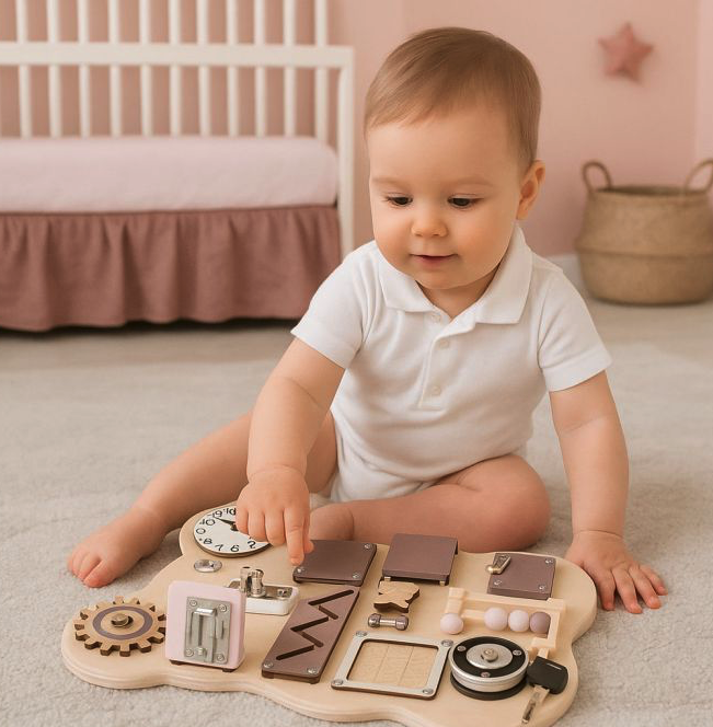 Tabuľa je vybavená 12 interaktívnymi prvkami, ktoré povzbudzujú deti k objavovaniu a cvičeniu jemnej motoriky. Deti môžu skúšať zámok s kľúčikom, otáčať farebné ozubené kolieska, používať počítadlo, nastavovať ručičky hodín či točiť rybársky navijak s kľukou. Každý prvok predstavuje nový podnet a učí deti princípu akcia–reakcia. Kombinácia dreva, kovových detailov, plastu a tkaniny robí tabuľu nielen bezpečnou a odolnou, ale aj atraktívnou vďaka rôznorodosti materiálov. Je to ideálna hračka na rozvoj logického myslenia, koordinácie oko–ruka aj trpezlivosti.