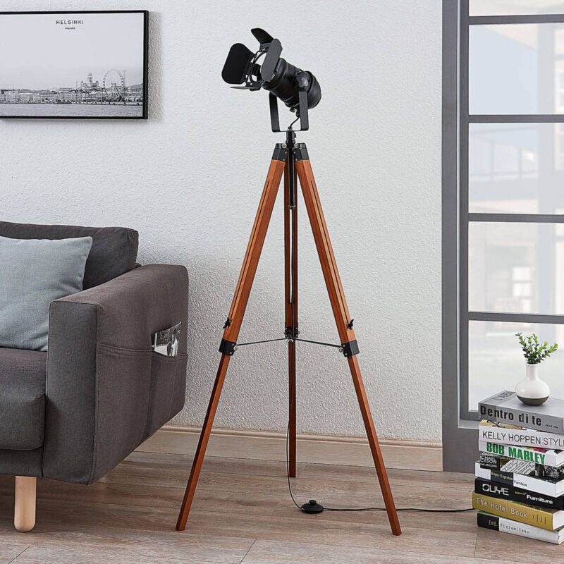 Trojnohá stojaca lampa Hilma s dreveným stojanom a tienidlom v tvare reflektora Stojaca lampa Hilma má trojnohý statív z dreva a tienidlo vôbec nie je klasickým tienidlom, ale namiesto neho má divadelný reflektor, takže lampa predstavuje načisto priemyselný dizajn. Pre každého, kto chce byť v centre pozornosti medzi vlastnými štyrmi stenami!