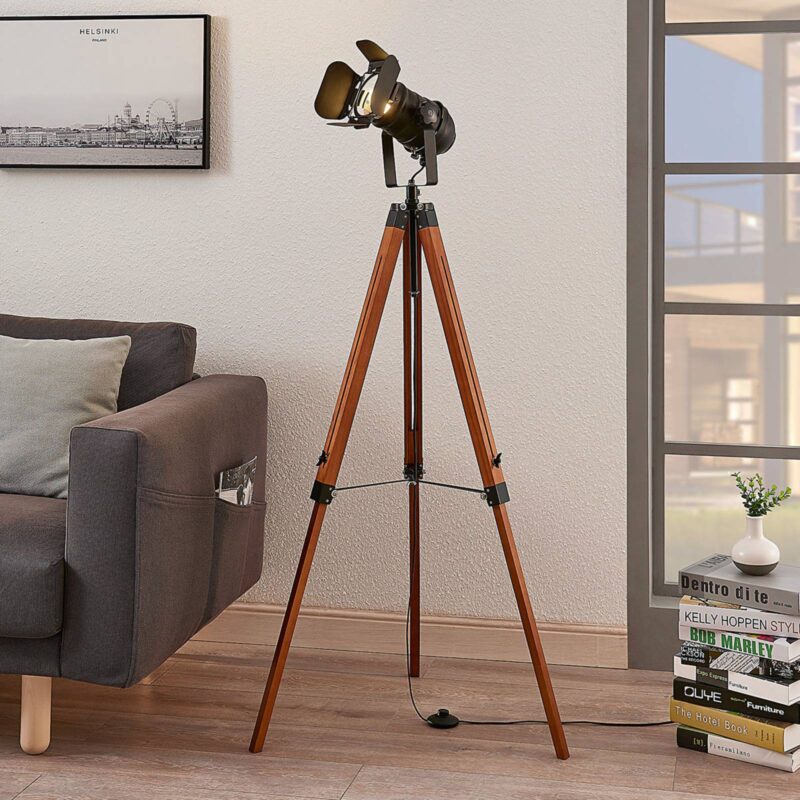 Drevená stojaca lampa Hilma s trojnohým stojanom