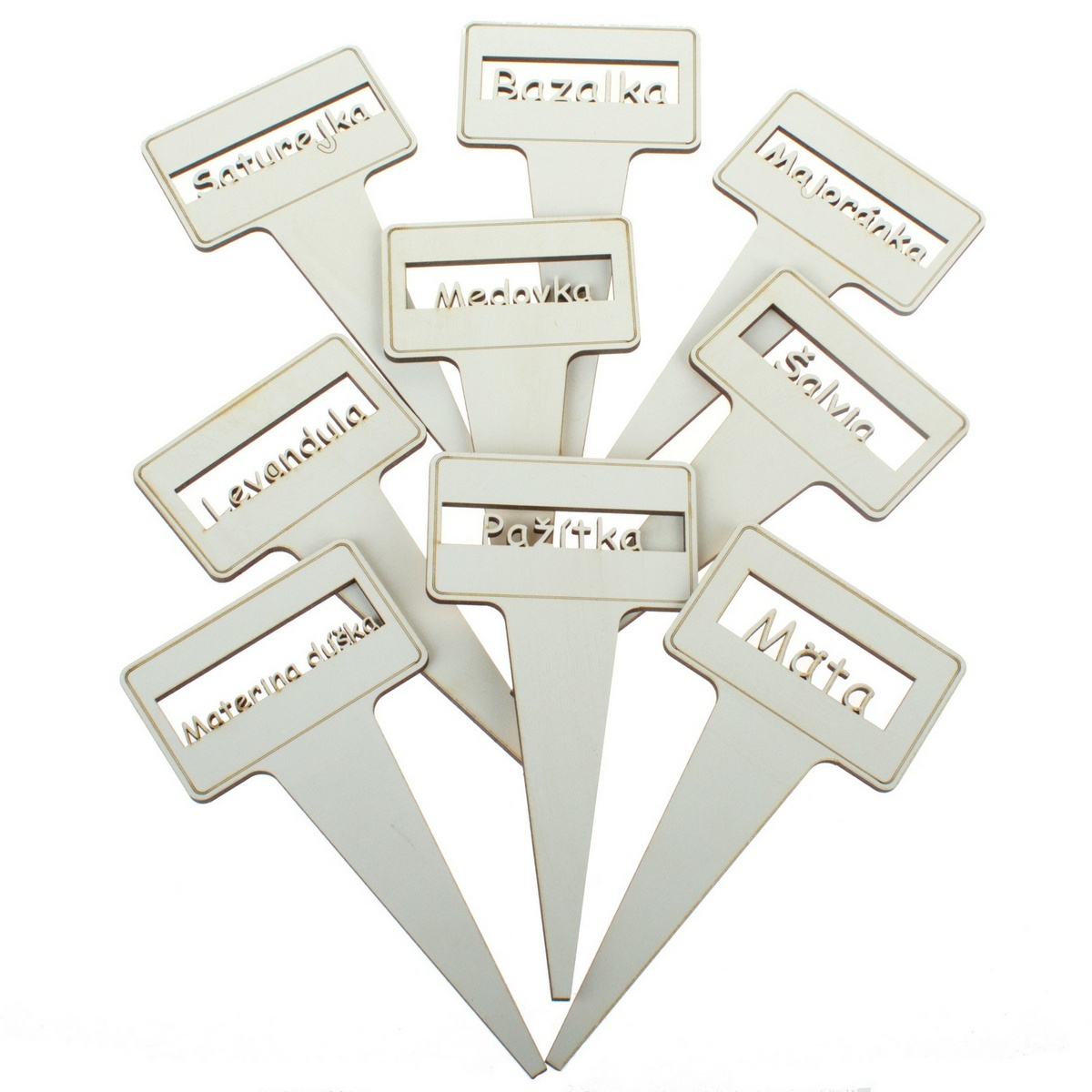 Drevené štítky na bylinky sú senzačným riešením pre každú záhradu, záhon a kvetináč, kde sa nachádzajú rozmanité druhy rastliniek pre ich jednoduché rozoznanie. Etikety s už vyrezanými popismi sa umiestňujú do pôdy zapichnutím k bližšie popisovanej plodine. Vďaka štítkom budete vedieť, čo kde rastie, bez rizika chyby a pomýlenia si rastlín.Praktická a zároveň dekoratívna vychytávka, ktorá svojím vzhľadom doplní bylinku o jej slovenský názov.