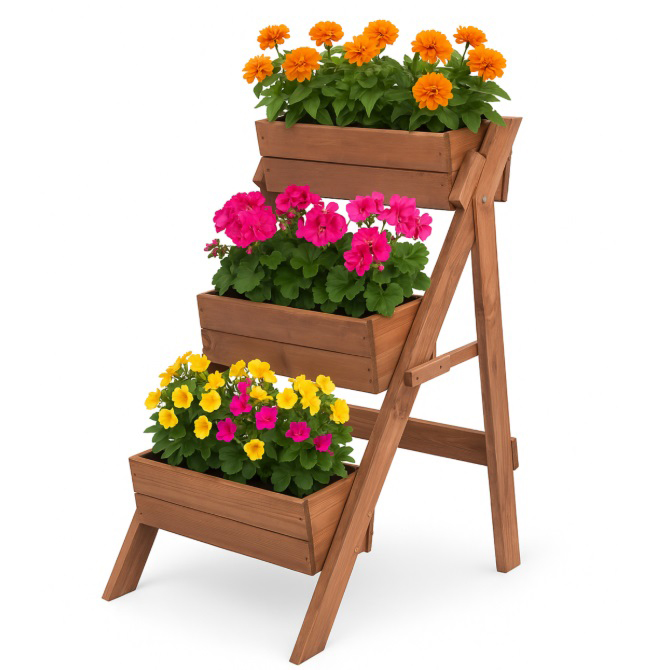 Vytvorte si útulný a štýlový vonkajší priestor s týmto 3-poschodovým dreveným stojanom na kvety! Tento praktický a dekoratívny kvetinový regál je vyrobený z kvalitného prírodného dreva a svojím dizajnom sa hodí do záhrady, na balkón aj terasu. Stojan na kvety z prírodného dreva je nielen praktickým, ale aj dizajnovým doplnkom, ktorý podčiarkne krásu každej rastliny a dodá vašej terase či záhrade ten pravý šmrnc. Vyberte si kvalitu, ktorá vydrží viac sezón! Tento kvetinový stojan vám umožní ušetriť priestor a zároveň štýlovo usporiadať vaše muškáty, surfínie, macešky, bylinky či sezónne dekorácie.