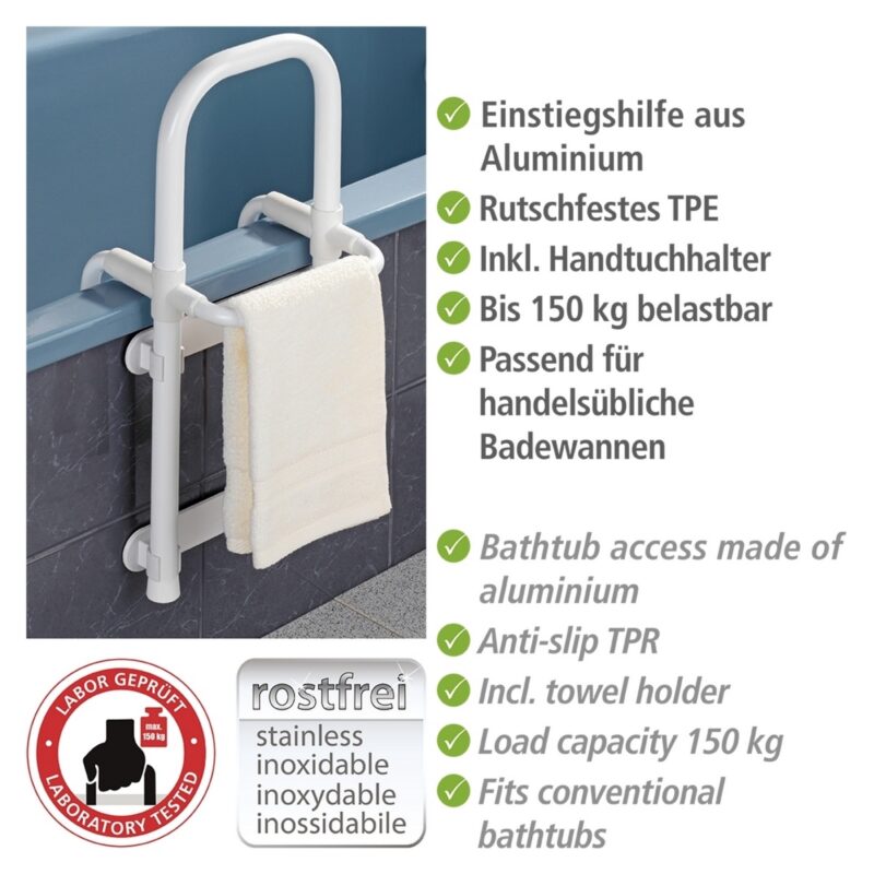 Toto kvalitné držadlo umožní seniorom alebo osobám s pohybovými ťažkosťami prekonať okraj vane a zaistí bezpečný vstup aj výstup z vane. Má praktický držiak na uterák. Je vhodné pre všetky štandardné vane, nastavíte ho podľa šírky okraja vane. Jednoducho sa montuje.