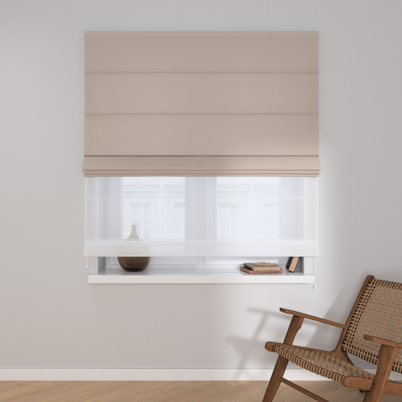 Rímska roleta Duo kombinuje funkciu závesu a záclony.Má dva mechanizmy na vyťahovanie rolety, pre vrchnú(dekoračná) látku na pravej strane a pre záclonu- (voal)na ľavej strane. Kanály sa nachádzajú v prednej časti žalúzie*.