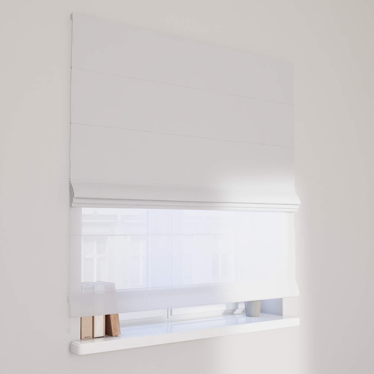 Rímska roleta Duo kombinuje funkciu závesu a záclony.Má dva mechanizmy na vyťahovanie rolety, pre vrchnú(dekoračná) látku na pravej strane a pre záclonu- (voal)na ľavej strane. Kanály sa nachádzajú v prednej časti žalúzie*.