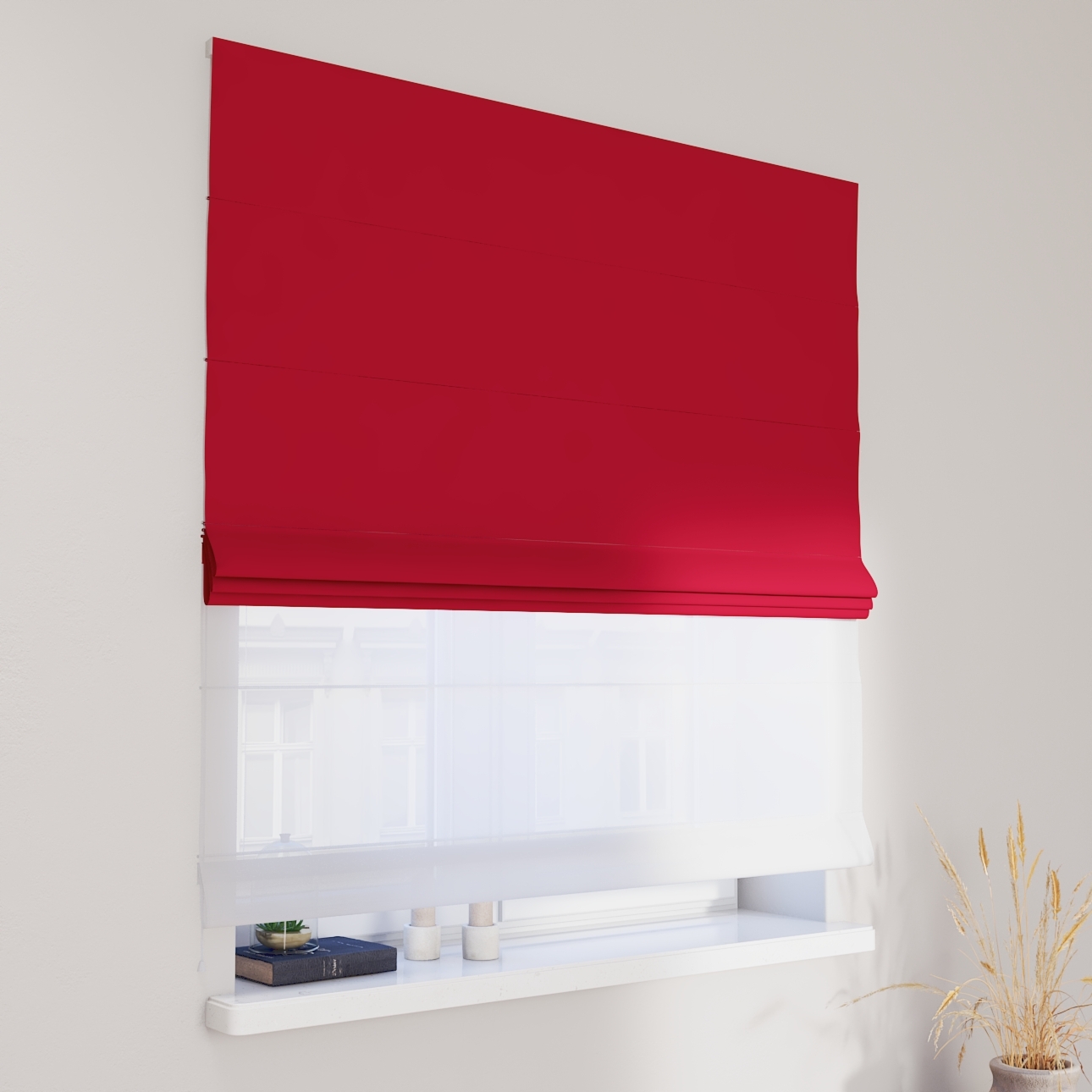 Rímska roleta Duo kombinuje funkciu závesu a záclony.Má dva mechanizmy na vyťahovanie rolety, pre vrchnú(dekoračná) látku na pravej strane a pre záclonu- (voal)na ľavej strane. Kanály sa nachádzajú v prednej časti žalúzie*.