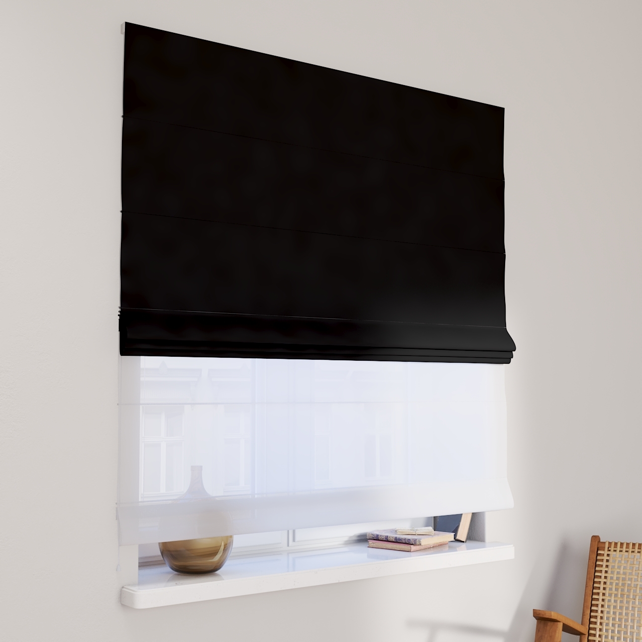 Rímska roleta Duo kombinuje funkciu závesu a záclony.Má dva mechanizmy na vyťahovanie rolety, pre vrchnú(dekoračná) látku na pravej strane a pre záclonu- (voal)na ľavej strane. Kanály sa nachádzajú v prednej časti žalúzie*.