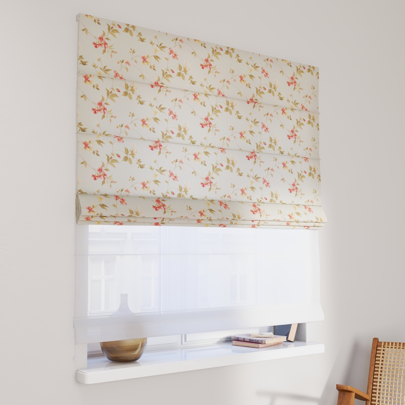 Rímska roleta Duo kombinuje funkciu závesu a záclony.Má dva mechanizmy na vyťahovanie rolety, pre vrchnú(dekoračná) látku na pravej strane a pre záclonu- (voal)na ľavej strane. Kanály sa nachádzajú v prednej časti žalúzie*.