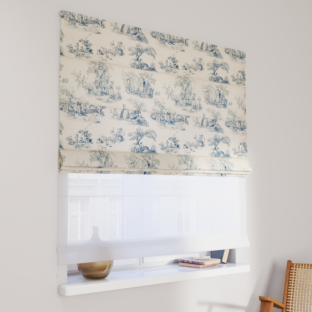 Rímska roleta Duo kombinuje funkciu závesu a záclony.Má dva mechanizmy na vyťahovanie rolety, pre vrchnú(dekoračná) látku na pravej strane a pre záclonu- (voal)na ľavej strane. Kanály sa nachádzajú v prednej časti žalúzie*.