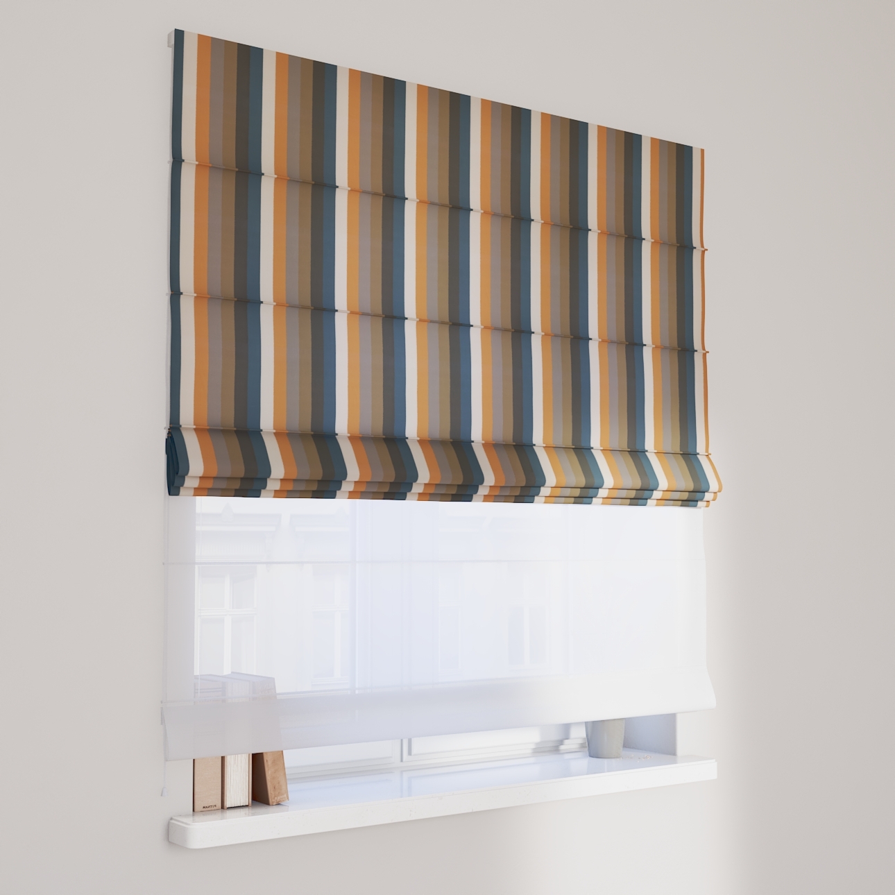 Rímska roleta Duo kombinuje funkciu závesu a záclony.Má dva mechanizmy na vyťahovanie rolety, pre vrchnú(dekoračná) látku na pravej strane a pre záclonu- (voal)na ľavej strane. Kanály sa nachádzajú v prednej časti žalúzie*.
