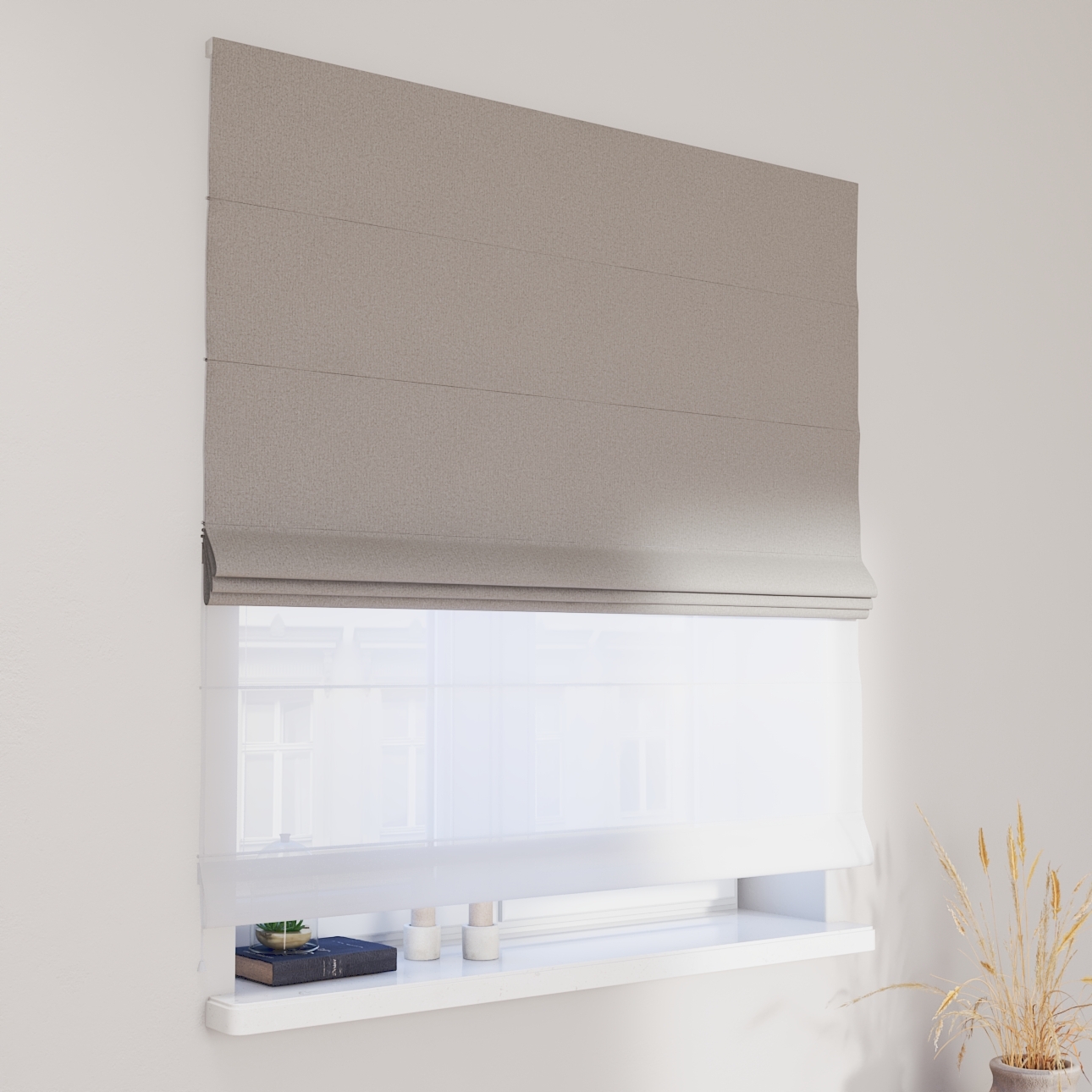 Rímska roleta Duo kombinuje funkciu závesu a záclony.Má dva mechanizmy na vyťahovanie rolety, pre vrchnú(dekoračná) látku na pravej strane a pre záclonu- (voal)na ľavej strane. Kanály sa nachádzajú v prednej časti žalúzie*.