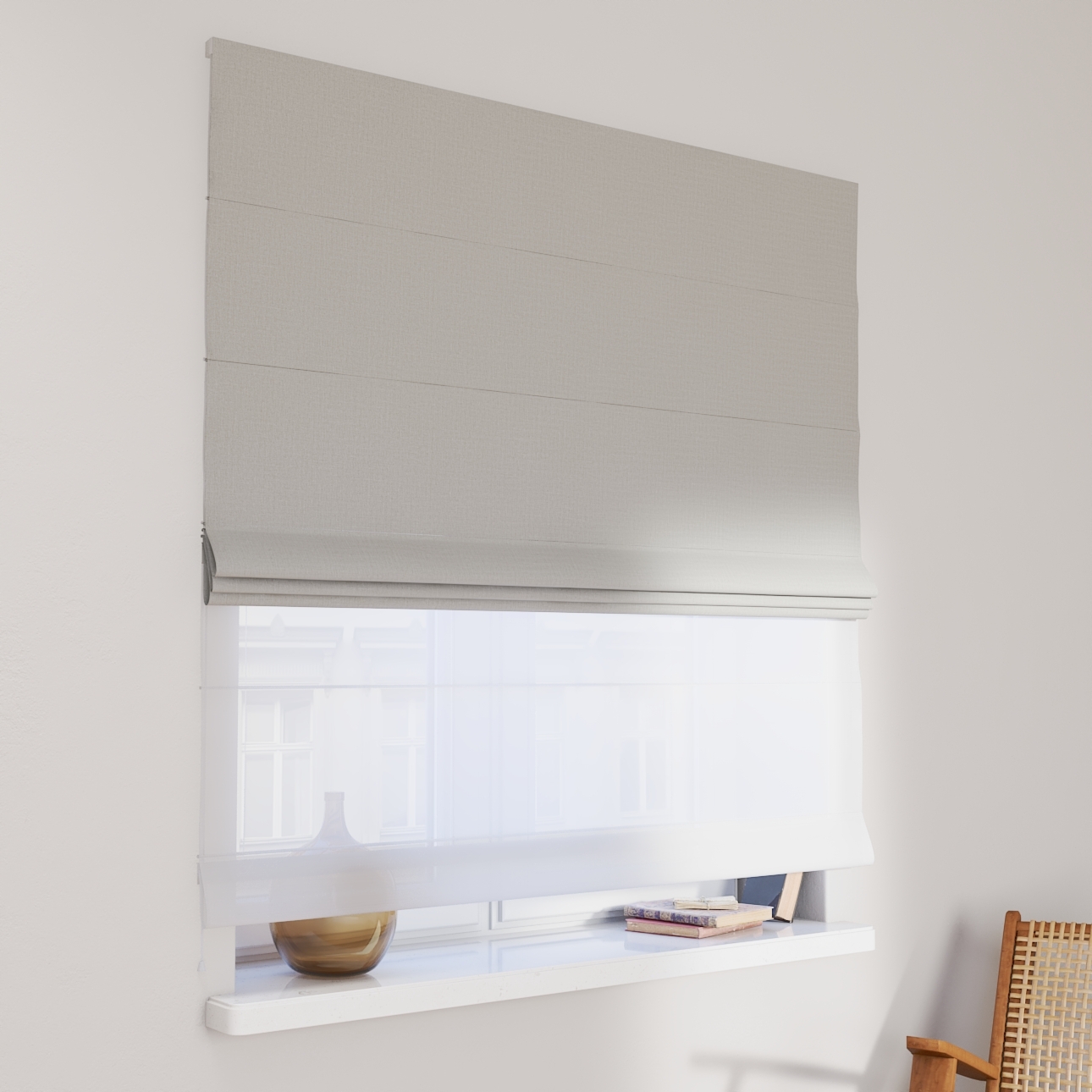 Rímska roleta Duo kombinuje funkciu závesu a záclony.Má dva mechanizmy na vyťahovanie rolety, pre vrchnú(dekoračná) látku na pravej strane a pre záclonu- (voal)na ľavej strane. Kanály sa nachádzajú v prednej časti žalúzie*.