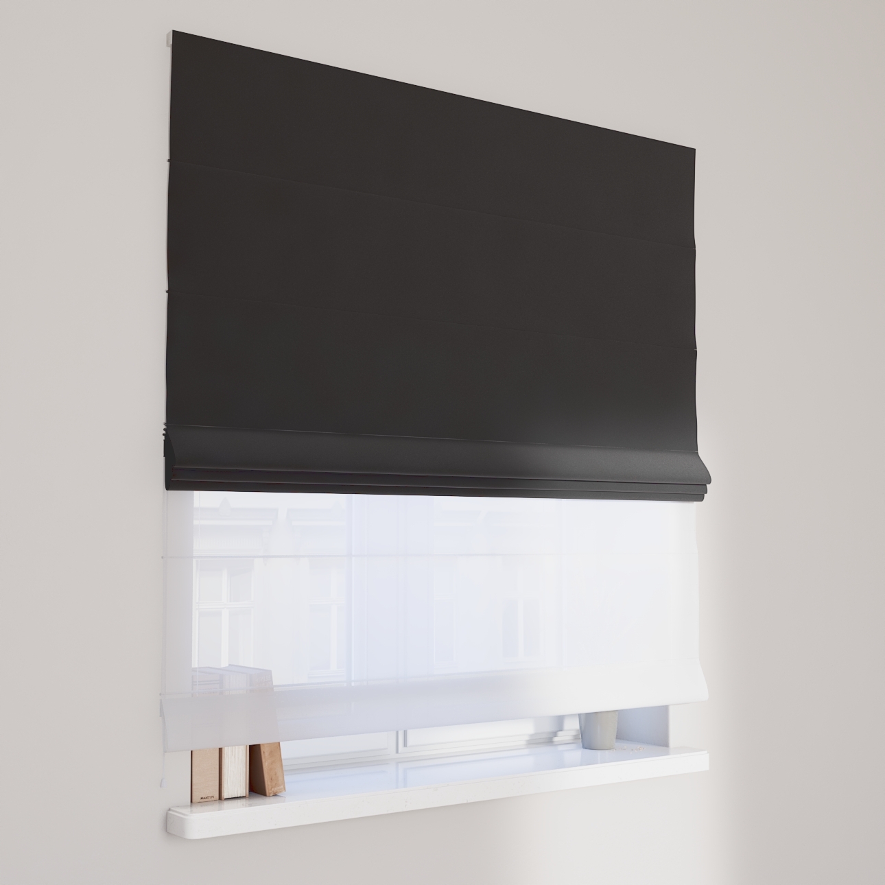Rímska roleta Duo kombinuje funkciu závesu a záclony.Má dva mechanizmy na vyťahovanie rolety, pre vrchnú(dekoračná) látku na pravej strane a pre záclonu- (voal)na ľavej strane. Kanály sa nachádzajú v prednej časti žalúzie*.