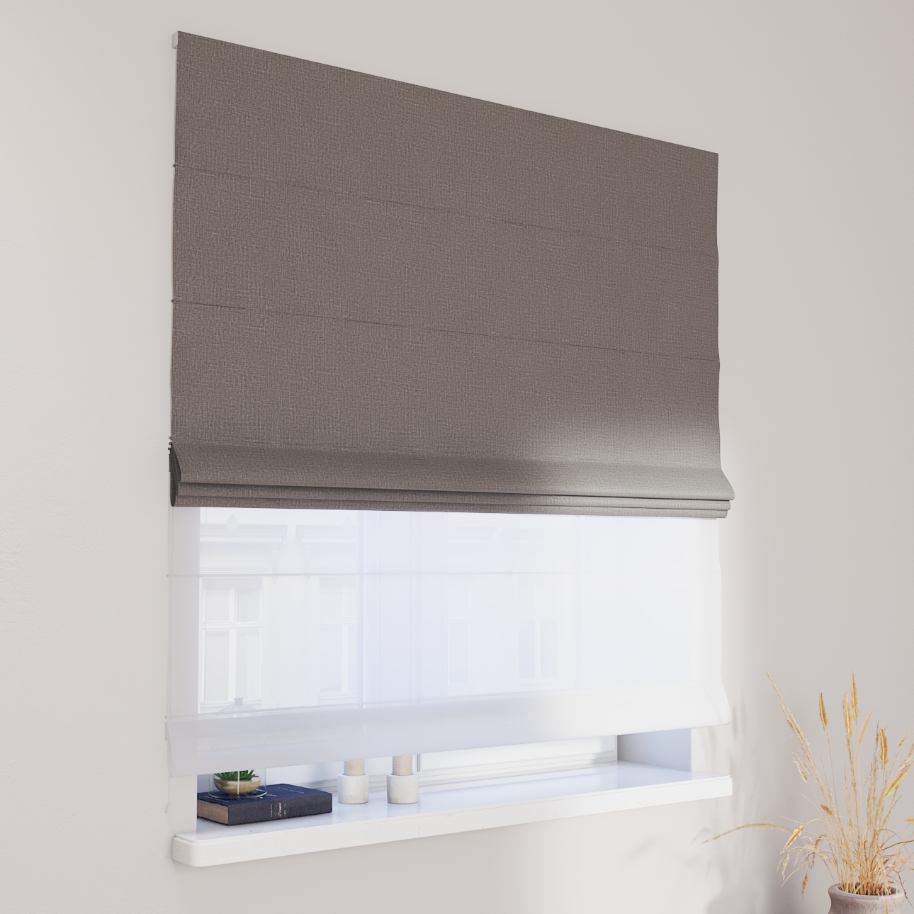 Rímska roleta Duo kombinuje funkciu závesu a záclony.Má dva mechanizmy na vyťahovanie rolety, pre vrchnú(dekoračná) látku na pravej strane a pre záclonu- (voal)na ľavej strane. Kanály sa nachádzajú v prednej časti žalúzie*.