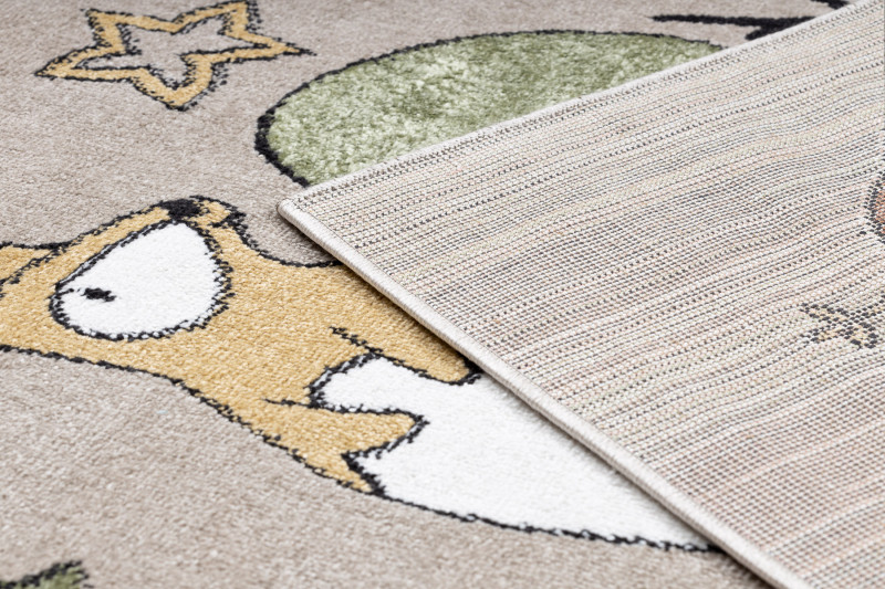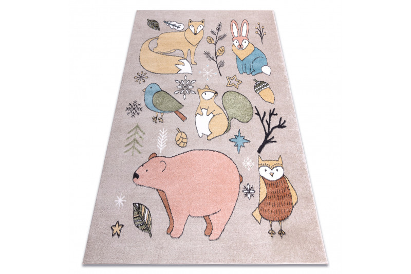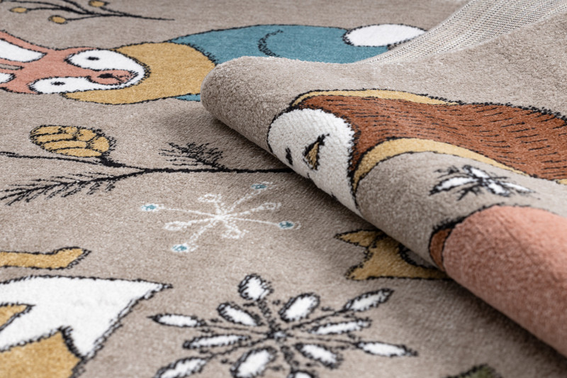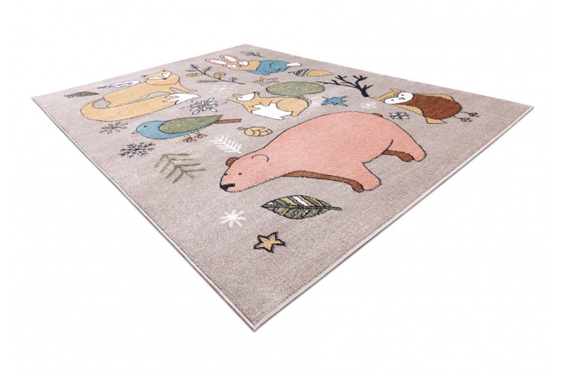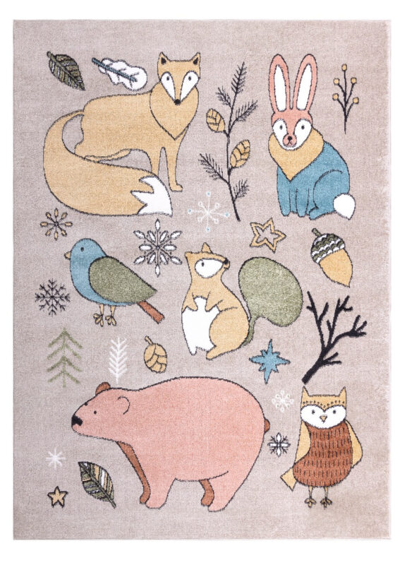 Detský kusový koberec Fun Forester beige prináša lesné zvieratká do izbičky. Veselé a hravé zvieratká urobia radosť vašim najmenším. Pestré farby a príjemný materiál z veľmi jemného strihaného vlasu zo 100% polypropylénu, neodrie žiadne kolená pri hraní. Tento typ materiálu tiež má výbornú teplotnú izoláciu, nemusíte sa už báť chladu z podlahy. Na výrobu nebola použitá žiadna toxická látka a tým výrobok je veľmi vhodný aj pre alergické deti.