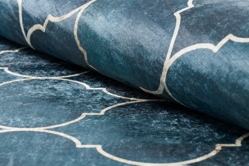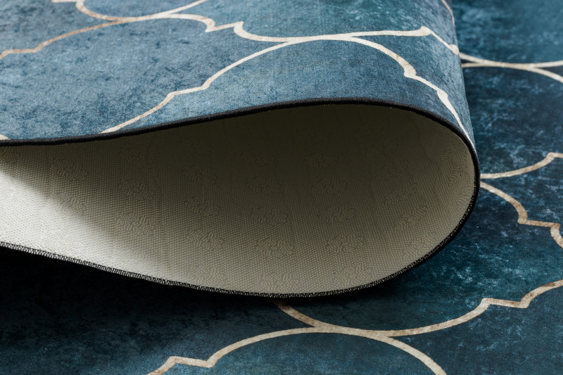 Koberec Andre Maroccan 1181 trellis blue je veľmi elegantný s arabským motívom v zlatej farbe na modrom pozadí. Má veľmi nízky strihaný vlas. Ide o koberec s veľmi jednoduchou údržbou. Na čistenie je možné využiť pranie pri teplote nepresahujúcej 30°C . Spodná strana je opatrená protišmykovou gumou, ktorá zaisťuje nekĺzanie koberca po podlahe. Hodí sa aj do priestorov s podlahovým vykurovaním. Uplatnenie nájde v obývacej izbe, v kuchyni, v kúpeľni aj na chodbe či v hale.