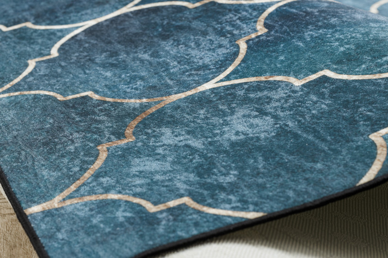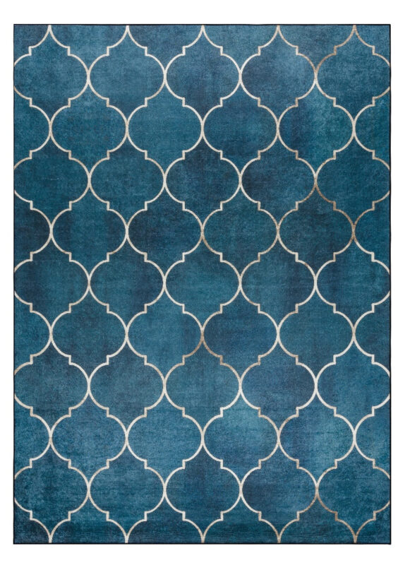 Koberec Andre Maroccan 1181 trellis blue je veľmi elegantný s arabským motívom v zlatej farbe na modrom pozadí. Má veľmi nízky strihaný vlas. Ide o koberec s veľmi jednoduchou údržbou. Na čistenie je možné využiť pranie pri teplote nepresahujúcej 30°C . Spodná strana je opatrená protišmykovou gumou, ktorá zaisťuje nekĺzanie koberca po podlahe. Hodí sa aj do priestorov s podlahovým vykurovaním. Uplatnenie nájde v obývacej izbe, v kuchyni, v kúpeľni aj na chodbe či v hale.
