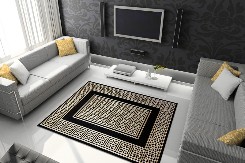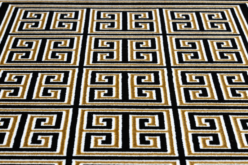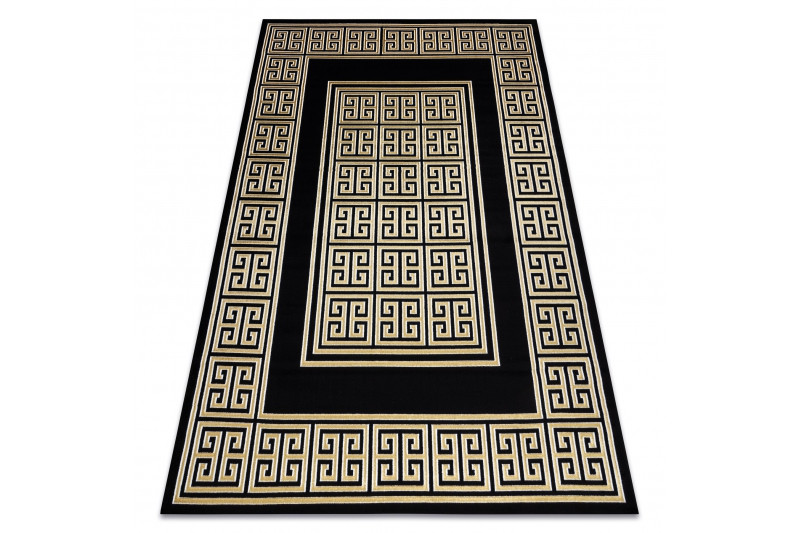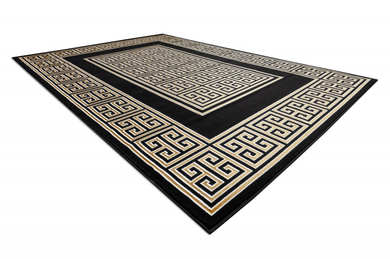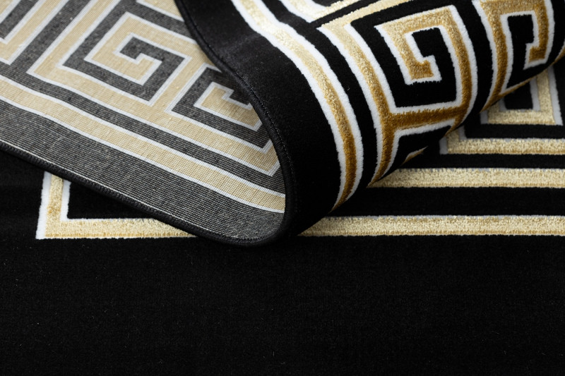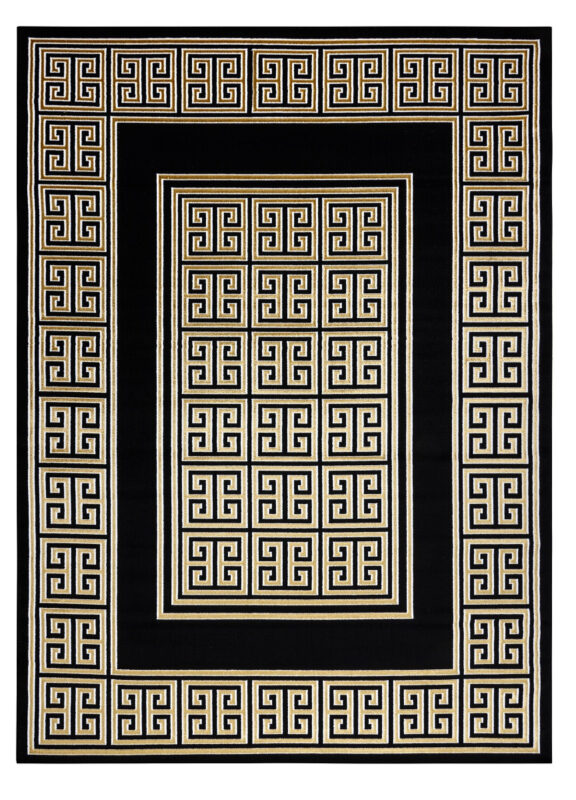 Koberec Gloss s gréckym motívom v čiernej farbe so zlatým vzorom. Tento veľmi zaujímavý a atypický koberec sa stane estetický stredobod miestnosti. Tento typ koberca sa veľmi bude hodiť do interiéru s mramorovou dlažbou v modernom štýle. Vďaka použitému materiálu je koberec stály a odolný. Vlákna vlasov sú tvorené do 3D efektu, ktorý umocňuje zaujímavý vzhľad.