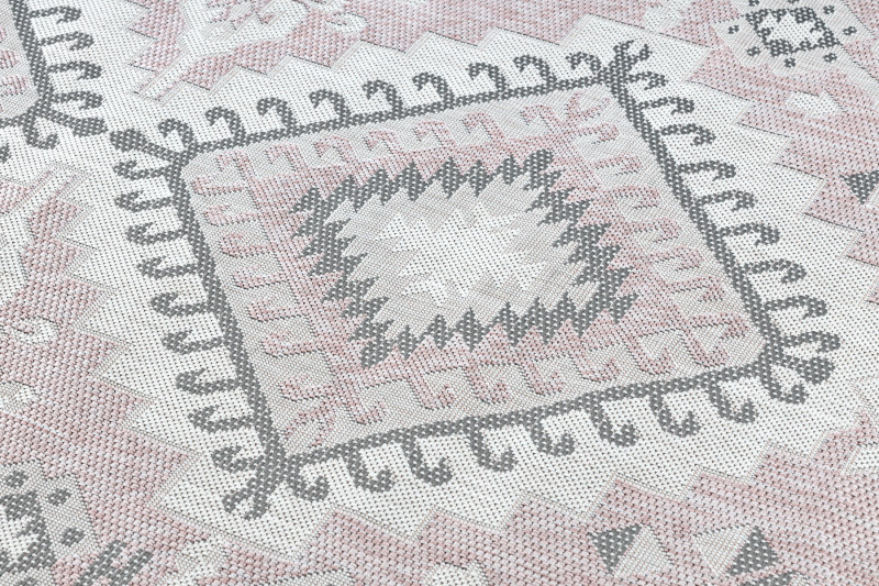 Kusový koberec Sion s aztéckou symbolikou v kombinácii ružovej a béžovej, patrí ku kobercom tkané do typu Sisál, ktoré majú absenciu vlasu a podkladu. Telo koberca tvorí veľmi pevné slučky, ktoré sú odolné a prepožičiavajú kobercu jednoduchú údržbu, odolnosť voči vysokej záťaži a poveternostným vplyvom. Koberec sa bude vynímať v obývacej izbe, v kuchyni a tiež aj na balkóne alebo terase. Krásny a originálny vzor vytvorí príjemný priestor na trávenie voľného času. Využitý materiál tiež zaručí stálosť farieb as obšitím po celom obvode odolnosť voči deformáciám.