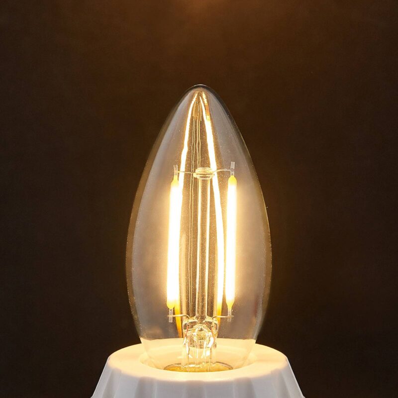LED žiarovka E14 Filament, 2 700 K s čírym sklom Táto LED žiarovka E14 s optickým vláknom je vhodná najmä na použitie v otvorených svietidlách, kde má byť zdroj svetla obzvlášť dekoratívny. Farba svetla LED diód s hodnotou 2 700 kelvinov je veľmi príjemne teplá biela, a preto je ideálna do obývacích izieb. Táto LED lampa sa používa v nástenných svietidlách, lustroch atď. táto LED žiarovka, ktorá sa používa v nástenných svietidlách, lustroch a pod. si vyžaduje len zlomok energie porovnateľnej žiarovky. Vlastnosti: – Porovnateľná hodnota žiarovky 23 W – Nie je stmievateľná – Uhol vyžarovania 320°