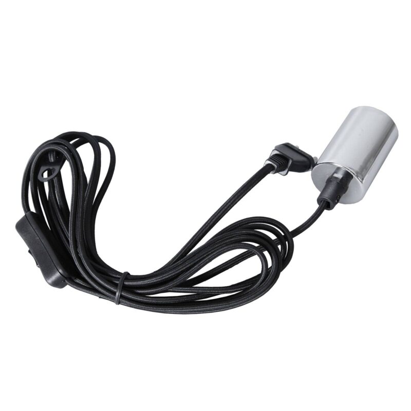 Zásuvka E27 v kovovom vyhotovení s čiernym plastovým káblom Zásuvka E27 Stil je vybavená 350 cm dlhým káblom z plastu. Na konci kábla je pripojená plochá euro zástrčka. Kábel je vybavený aj prepínačom. Objímka je vyrobená z kovu a kábel je vďaka svojej dĺžke ideálny na dekoratívne účely. – Osvetľovacie zariadenie nie je súčasťou dodávky