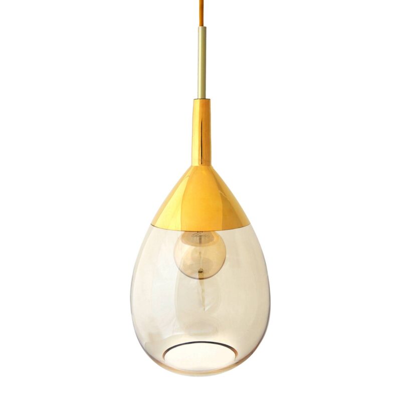 Závesná lampa Lute M s priesvitným tienidlom z fúkaného skla Všestranne fascinujúce svetlo vytvára závesné svietidlo Lute M. Dizajn, ktorý vychádza z tela hudobného nástroja – lutny – vytvorila Susanne Nielsen. Lute S vyrába vo vysokej kvalite spoločnosť EBB & FLOW, dánska značka, ktorá predáva moderné dizajny. Sklenené tienidlo svietidla Lute M je fúkané a priesvitné a umožňuje pohľad na zdroj svetla zo všetkých strán. Preto sa odporúča použiť krásnu žiarovku na zvýšenie dekoratívnosti. Vhodné žiarovky si môžete objednať samostatne prostredníctvom príslušenstva. Zásuvka je vyrobená z bakelitu v čiernej farbe, závesný prvok je z lakovaného kovu zlatej farby, ktorý je obzvlášť pôsobivý vo vyžarovanom svetle, a kábel je vyrobený z textilného materiálu zlatej farby.