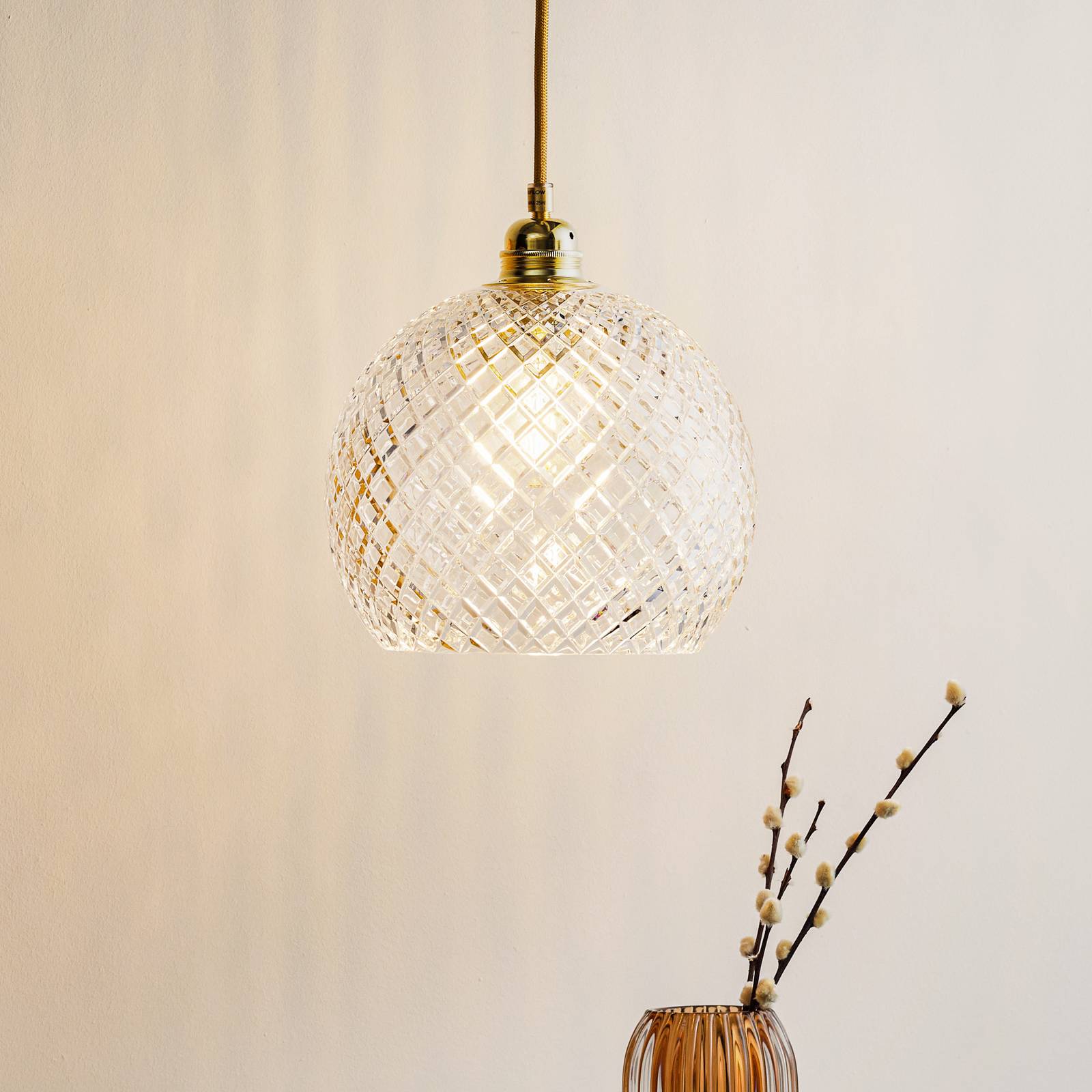 Závesné svietidlo Rowan s krištáľovým sklom a zlatým kontrastom Ručne fúkané telo z krištáľového skla je zvláštnosťou dizajnu závesného svietidla Rowan. Vďaka tomu svetlo jasne osvetľuje miestnosť zo všetkých strán. Držiak svietidla a vysokokvalitný textilný kábel, ktoré sú vyhotovené v lesklom zlatom odtieni, vytvárajú krásny kontrast a sofistikovane dotvárajú dizajn. Vďaka svojmu skôr klasickému vzhľadu a jednoduchému dizajnu je závesné svietidlo Rowan ideálne na doplnenie mnohých rôznych štýlov interiéru. Či už je svetlo Rowan nainštalované jednotlivo alebo v skupine, v rohoch alebo nad stolom, vždy je dekoratívnym pútačom pozornosti. Mladá dánska značka EBB & FLOW je symbolom vysokokvalitných dekoratívnych svetiel. Séria Rowan je príkladom úspešnej symbiózy ručne fúkaného skla, vysokokvalitných textílií a kovových prvkov, ktoré charakterizujú každé svietidlo vytvorené zakladateľkou spoločnosti Susanne Nielsenovou. Tienidlo je vyrobené z ručne fúkaného skla. Každá lampa je jedinečná; vzhľadom na výrobný proces sa môžu vyskytnúť drobné odchýlky, ako sú malé vzduchové vrecká atď.