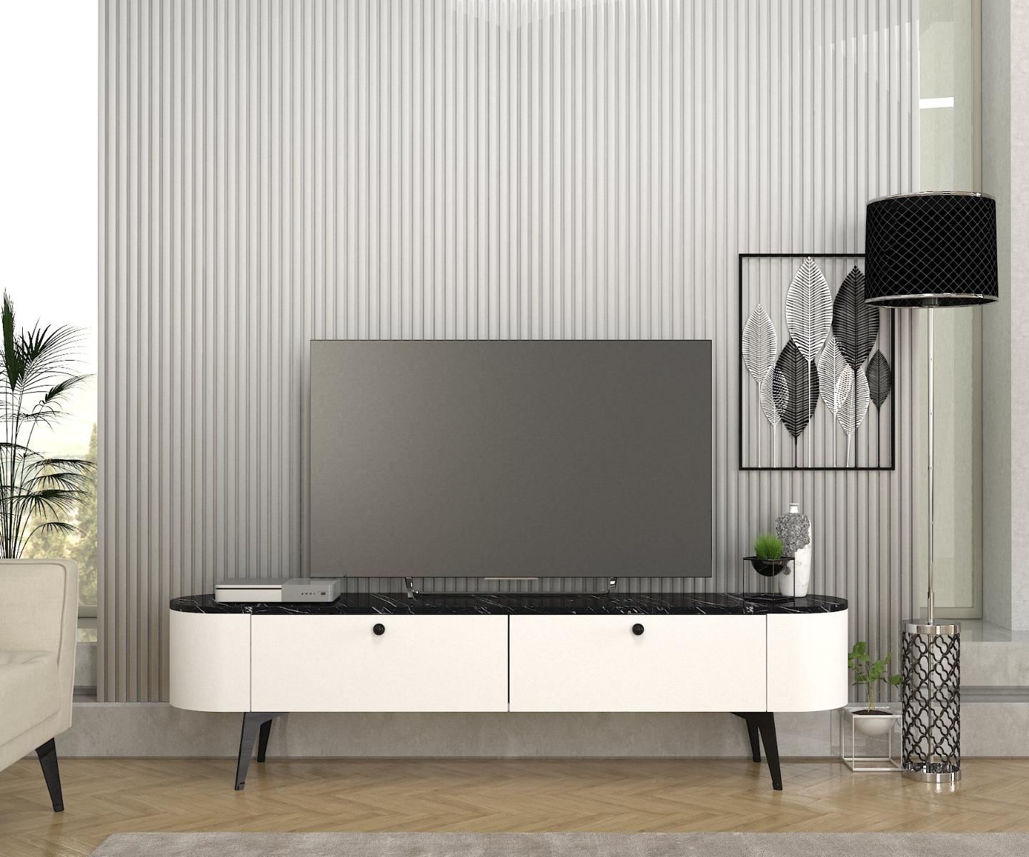 TV stolík EGYPTDodajte svojej obývačke elegantný a luxusný prvok s TV stolíkom EGYPT. Tento štýlový a praktický kus nábytku je ideálny na umiestnenie vašej televízie a ďalších mediálnych zariadení, prinášajúcich do vášho interiéru moderný a sofistikovaný vzhľad.Špecifikácia produktu:Typ tovaru: TV stolíkVhodné do miestnosti: Obývacia izbaMateriál: LTDRozmer: 180 x 46.8 x 35 cmFarba: Biela + mramorVybavenie: SkrinkyPočet dvierok: 2Hrúbka materiálu: 18 mmDodatočné informácie: Dodávame v demonteTV stolík EGYPT je skvelou voľbou pre každého, kto hľadá funkčné a estetické riešenie pre svoju obývaciu izbu. Vyrobený z kvalitného LTD materiálu s hrúbkou 18 mm, zaisťuje pevnosť a dlhú životnosť. Kombinácia bielej farby a mramorového vzhľadu dodáva stolíku moderný a luxusný vzhľad, ktorý sa hodí do akéhokoľvek interiéru.Vďaka svojmu vybaveniu skrinkami a dvoma dvierkami poskytuje televízny stolík EGYPT dostatok úložného priestoru pre vaše mediálne zariadenie, BR, knihy a ďalšie doplnky. Dodávame v demonte, čo zaručuje bezpečnú prepravu a jednoduchú montáž. Pridajte do svojho domova tento jedinečný a praktický kúsok nábytku a užívajte si jeho výhody každý deň.