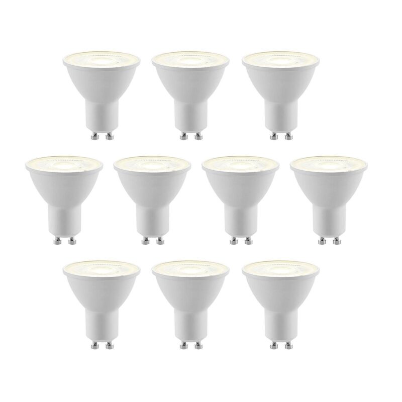 LED reflektor GU10 5W s univerzálnou bielou farbou svetla, balenie 10 ks Tento reflektor LED GU10 sa dodáva v balení po 10 kusoch. Vydáva zaostrené svetlo pod uhlom lúča 36 °. – Svetlá farba univerzálna biela 4 000 K – nestmievateľné
