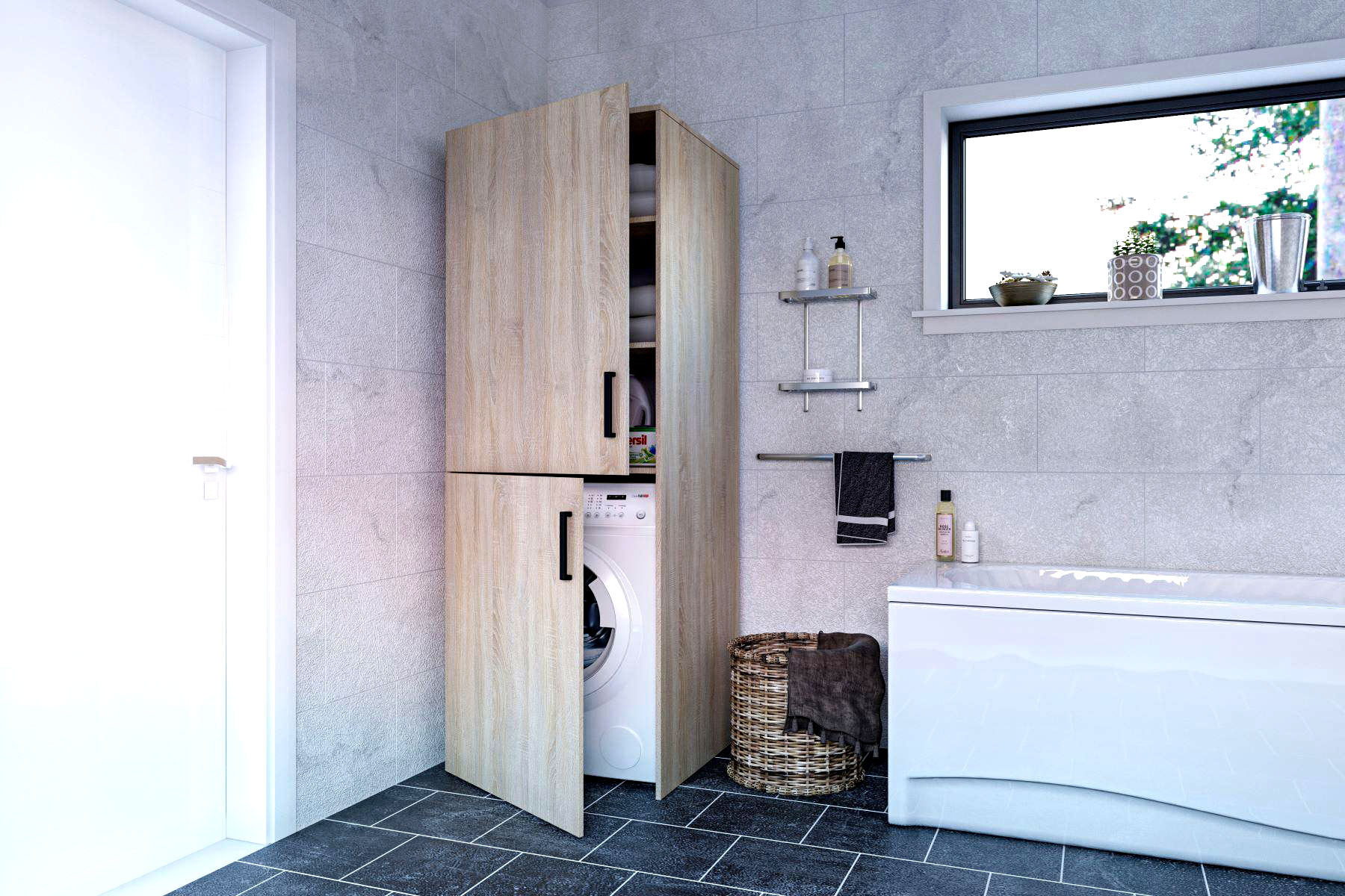 Zaujímavo riešená skrinka na práčku predstavuje praktické riešenie, ako využiť úložný priestor nad práčkou a držať v ňom čistiace prostriedky a kúpeľňové doplnky pekne usporiadané v policiach za dvierkami mimo dohľadu.Skrinka je vyrobená z kvalitnej LTD dosky. Farebné prevedenie dub Sonoma.Rozmery: v/š/h: 190 x 70 x 68 cm.Dodávame v demonte.