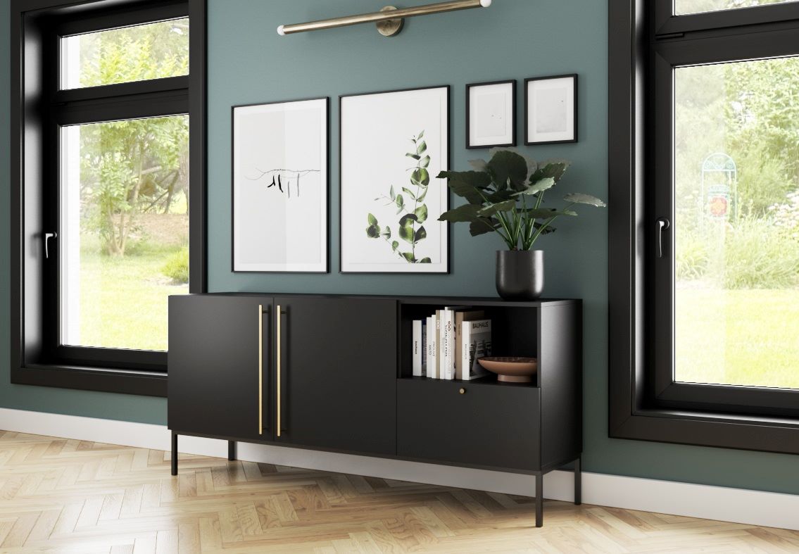 Veľká komoda z kolekcie ELJEN poteší všetkých milovníkov industriálneho štýlu. Je spojením kvalitného MDF materiálu a čiernych kovových nôh vysokých 20 cm. Je dvojdverová, disponuje jednou zásuvkou s tichým dovieraním. V ponuke sú dve farebné prevedenia, pričom sa líšia aj spôsobom otvárania, čiernu komodu zdobia zlaté úchyty.Rozmery (ŠxVxH): 180 x 80 x 40 cm.V našej ponuke nájdete ďalšie prvky z kolekcie ELJEN, vďaka ktorej si zariadite Vašu obývačku, či pracovňu moderne a štýlovo.Dodávame v demonte.