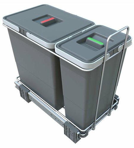 S výsuvnými odpadkovými košmi Ecofil získate odolný a kvalitný systém na pohodlné triedenie odpadu. Koše sa vysúvajú z pevne zabudovaných pojazdov v skrinke po otvorení dvierok a vyťahovanie je plné, takže sa pohodlne dostanete ku každej nádobe.Inštalácia je jednoduchá a zvládnete ju svojpomocne sami. Iba zaskrutkujete 4 skrutky a kôš je pevne pripevnený ku dnu skrinky. Plastové odpadkové nádoby majú na hornej strane výrez, pomocou ktorého je možné do jednej nádoby umiestniť dva vrecká a tým si rozšíriť počet druhov triedeného odpadu. Plastové nádoby sú vyrobené z kvalitného, plne recyklovateľného materiálu. Rovnako tak rám koša, ktorý je vyrobený z chrómovanej ocele.Celá konštrukcia je dostatočne pevná a veľmi dobre sa udržuje. Ložiská pojazdov pracujú ticho a sú bezúdržbové.
