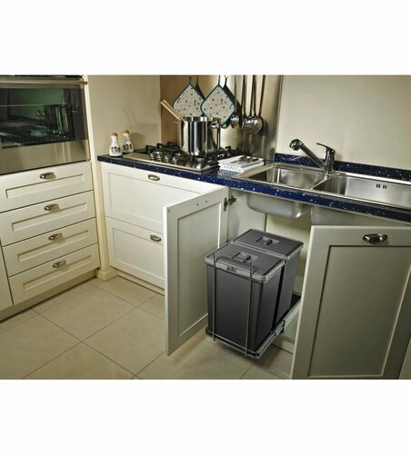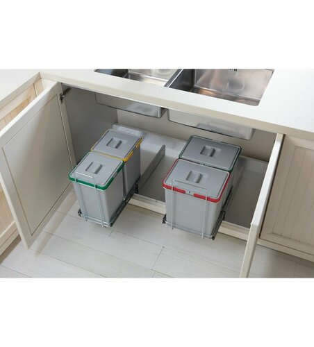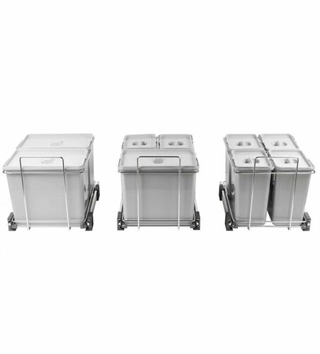 S výsuvnými odpadkovými košmi Ecofil získate odolný a kvalitný systém na pohodlné triedenie odpadu. Koše sa vysúvajú z pevne zabudovaných pojazdov v skrinke po otvorení dvierok a vyťahovanie je plné, takže sa pohodlne dostanete ku každej nádobe.Inštalácia je jednoduchá a zvládnete ju svojpomocne sami. Iba zaskrutkujete 4 skrutky a kôš je pevne pripevnený ku dnu skrinky. Plastové odpadkové nádoby majú na hornej strane výrez, pomocou ktorého je možné do jednej nádoby umiestniť dva vrecká a tým si rozšíriť počet druhov triedeného odpadu. Plastové nádoby sú vyrobené z kvalitného, plne recyklovateľného materiálu. Rovnako tak rám koša, ktorý je vyrobený z chrómovanej ocele. Celá konštrukcia je dostatočne pevná a veľmi dobre sa udržuje. Ložiská pojazdov pracujú ticho a sú bezúdržbové.