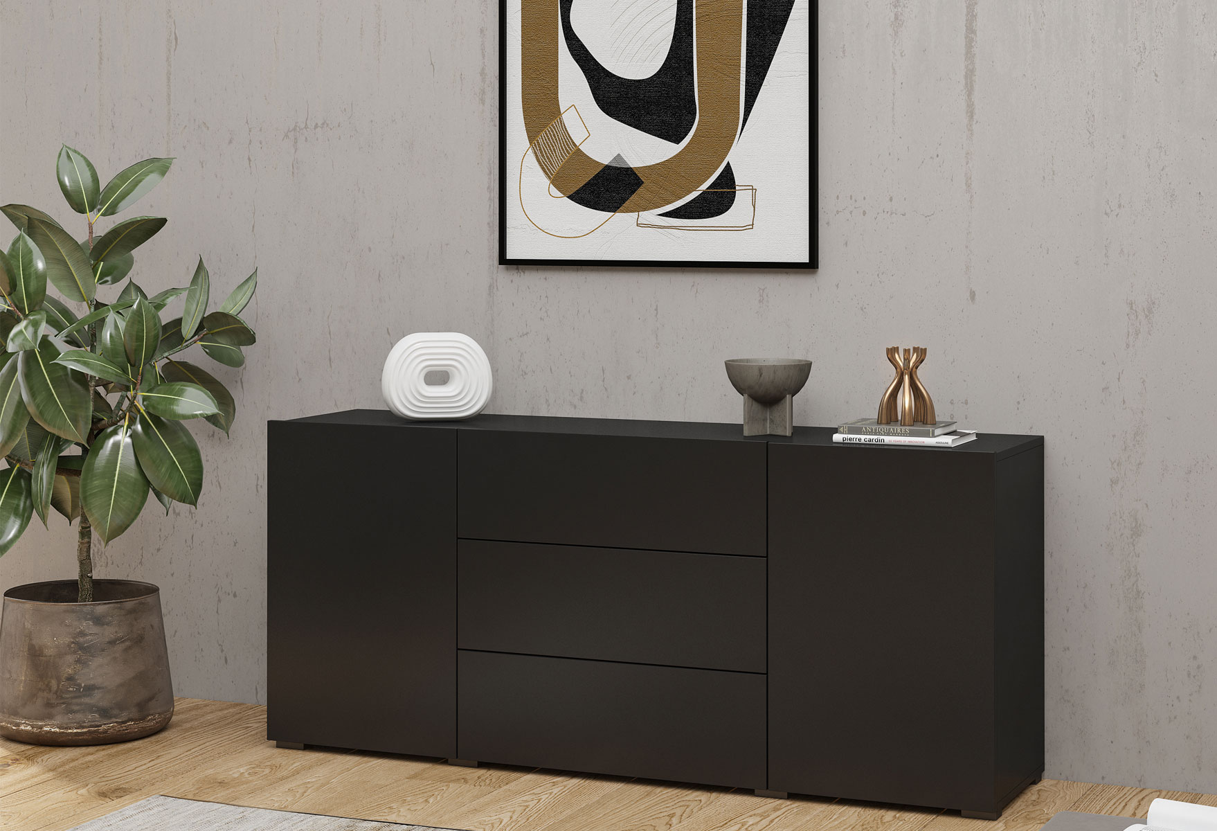 Na sektore EMMA Vás ako prvé zaujme jeho taliansky dizajn. Celý sektor je k dispozícií vo viacerých farbách aby ste si mohli zladiť Vašu obývačku podľa Vašich predstáv. Má bezúchytový systém otvárania skriniek a celokovové pánty. Univerzálnosť sektoru zaručuje možnosť zavesiť si komponenty na stenu, takže je len na Vás či si skrinky zavesíte na stenu alebo necháte postavené na zemi.Komoda EMMA 26 má po stranách dvoje dvierka za ktorými sú praktické police, ktoré Vám poskytnú dostatok úložného priestoru a v strede tri zásuvky.Rozmer (ŠxVxH): 140 x 62 x 35 cmFarebné prevedenie : čierna/ dub wotanNábytok je dodávaný v demonte.