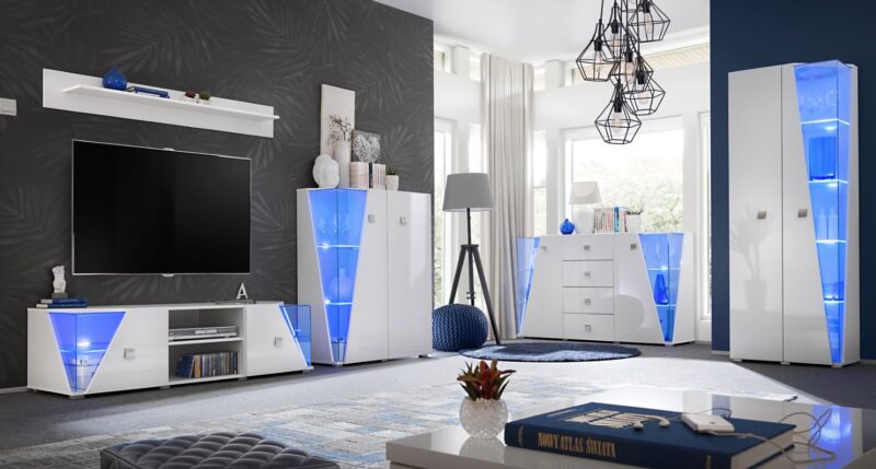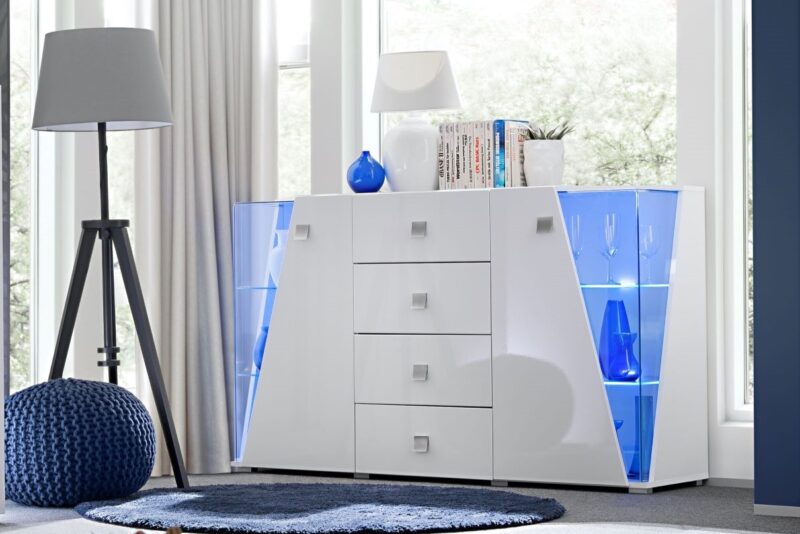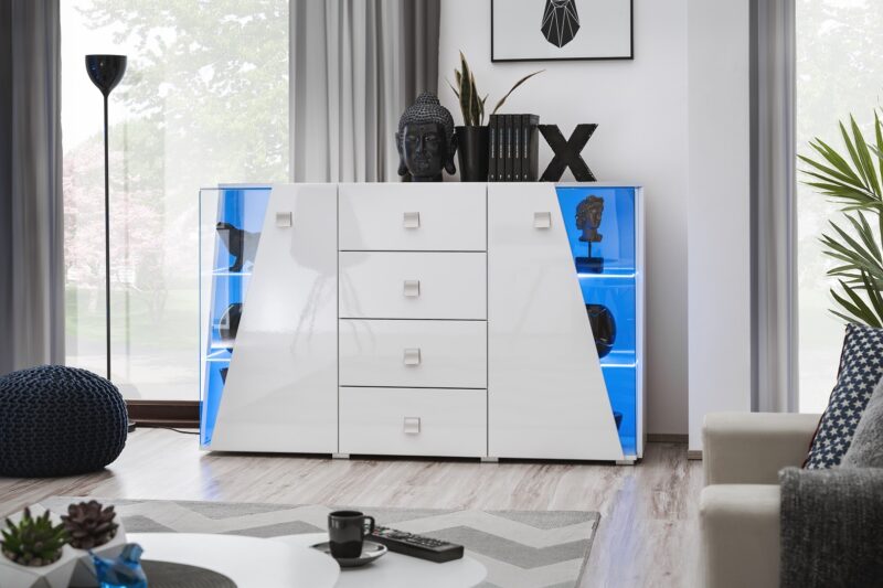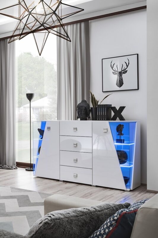 Komoda ENGY výniká svojím dizajnom.Komoda má netradičné rohové zasklenie a vďaka LED osvetleniu budú zvýraznené Vaše oblubené dekorácie alebo spomienkové predmety.Komoda je dvojvedverová za ktorými su dve sklenené poličky, v strede komody sa nachádzaju 4 praktické zásuvky.Kovové nožičky a úchyty dodajú ďalšie plus k modernému dizajnu.Farebné prevedenie:biela/biely lesk.Komodu môžete skombinovať s ostatnými prvkami zostavy ENGY a vytvoriť súdržny priestor obývacej izby.Rozmery (š/v/h):(150/100/45)cm.Dodávame v demonte, pričom montáž je veľmi jednoduchá.