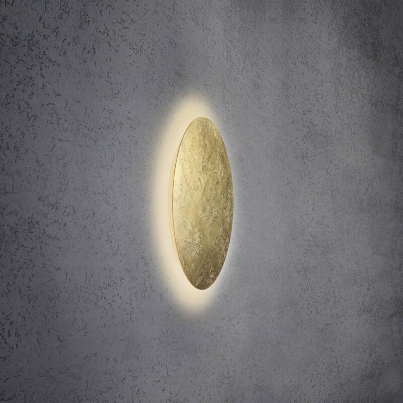Moderné nástenné svietidlo LED Blade z drahého plátkového zlata Nepriamo svietiace nástenné svietidlo Blade sa vyznačuje príjemným svetelným efektom a moderným i hodnotným vzhľadom. Svietidlo od výrobcu Escale okamžite upúta pozornosť svojím nepravidelne štruktúrovaným zlatým povrchom. Kruhový disk z hliníka zakrýva LED diódy na zadnej strane, takže ich teplé biele svetlo vyžaruje len v smere steny, kde vytvára rozptýlené svetlo okolo svietidla. – Externý stmievateľný triak – možnosť alternatívneho pripojenia pomocou zásuvného kábla (pozri príslušenstvo) – možno použiť aj ako stropné svietidlo