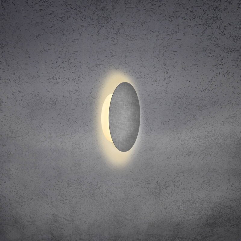 Moderný betónový vzhľad – nástenné svietidlo Blade LED s nepriamym svetlom Nástenné svietidlo Blade LED od výrobcu Escale má moderný vzhľad a príjemný neoslňujúci svetelný efekt. Plochý kruhový kryt z hliníka v nepravidelne štruktúrovanej betónovej sivej farbe tvorí viditeľnú časť. LED diódy sú namontované za ním tak, že ich teplé biele svetlo svieti cez úzku priehlbinu medzi krytom a stenou a odráža sa na zadnej strane. Na stene okolo svietidla tak vzniká rozptýlene osvetlený dvor – externe stmievateľný triakom – možnosť alternatívneho pripojenia pomocou zástrčkového kábla (pozri príslušenstvo) – možno použiť aj ako stropné svietidlo