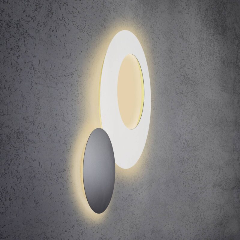 Biele nástenné svietidlo LED Blade Open – moderný dávkovač svetla na nepriame osvetlenie Viditeľnú časť nástenného svietidla Blade Open LED od spoločnosti Escale tvorí hladký disk z hliníka v matnej bielej farbe, ktorý je trochu mimo stredu a má okrúhly otvor. Teplé biele LED diódy sú integrované na zadnej strane. Cez výrez v skle je viditeľná nimi osvetlená stena; okrem toho sa oblasť okolo svietidla javí ako rozptýlené svetlo. Výsledné nepriame osvetlenie má príjemný neoslňujúci efekt a v kombinácii s dizajnom robí z lampy Blade Open ideálnu voľbu pre moderné obývacie izby a salóny. – Externý triak stmievateľný – možnosť alternatívneho pripojenia pomocou zásuvného kábla (pozri príslušenstvo) – možno použiť aj ako stropné svietidlo
