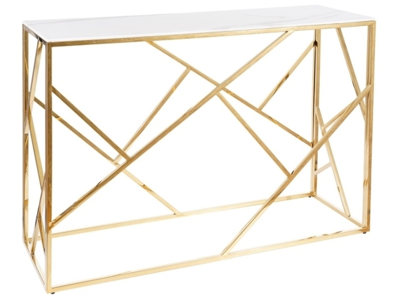 Kovová konzola ESKADA moderného dizajnu. Konzola je vhodná do moderných interiérov.Konštrukcia je kovová v zlatom prevedení, vrchná doska je vyrobená z tvrdeného skla s efektom mramoru.Rozmery (výška/šírka/hĺbka v cm): 78/120/40.V tomto dizajne nájdete v našej ponuke aj konferenčné stolíky. Dodávame v demontovanom stave.