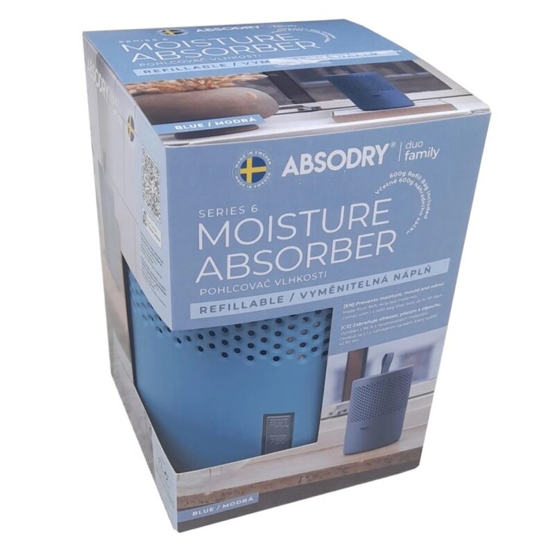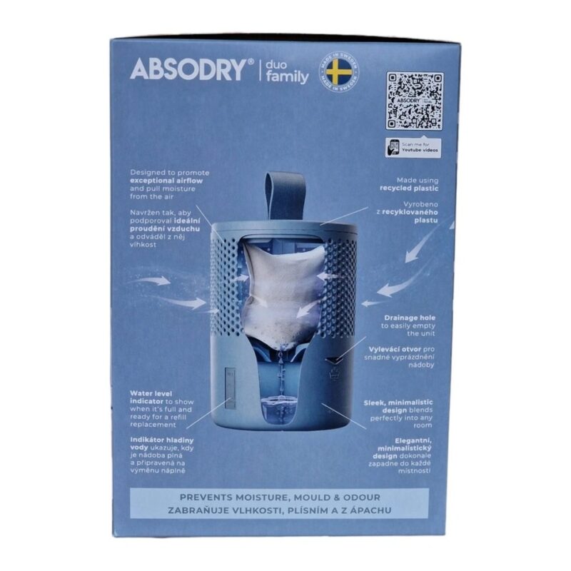 Pohlcovače vlhkosti a zápachu Everbrand Sweden sú perfektnou ukážkou škandinávskeho dizajnu a maximálnej funkčnosti. Znížte riziko vzniku plesní a nepríjemného zápachu s pohlcovačom vlhkosti Absodry v tvare nenápadného valca, ktorého dizajn je navrhnutý tak, aby sa hodil do každej modernej domácnosti. Funguje na princípe pasívnej prevádzky (bez el. energie), preto je úplne tichý.Súčasťou pohlcovača je vrecko s kryštálmi, ktoré absorbujú vzdušnú vlhkosť a tiež zápach. Vlhkosť kondenzuje v kryštáloch a odkvapkáva do spodnej časti nádoby, kde je nádržka na túto kondenzovanú vodu s objemom 1 litra. Na samotnom pohlcovači je potom vodoznak, podľa ktorého budete mať prehľad o množstve kondenzovanej vody.Aby cirkulujúci vzduch mohol pretekať jednotlivými otvormi a bola zaistená jeho maximálna funkčnosť, je potrebné umiestniť odvlhčovač najlepšie do priestoru (neopierať o stenu).Pohlcovač je určený do miestnosti s objemom max. 50 m3 (čo je v prepočte cca 25 m2) a jedna náplň hygroskopických kryštálov vydrží až 3 mesiace. Pokiaľ bude nádržka plná, je možné ju jednoducho vyprázdniť cez vypúšťací otvor bez toho, aby ste museli vyberať vrecko s kryštálmi.S prebytočnou vlhkosťou sa najčastejšie stretávame v kúpeľni alebo v kuchyni. Pokiaľ je prekročená ideálna hladina vlhkosti (40-60 %), hrozí vznik alergie či dýchacích ťažkostí. Pohlcovač vlhkosti Absodry vás ohromí tým, koľko vzdušnej vlhkosti dokáže zachytiť v priebehu niekoľkých dní. Váš domov sa tak opäť stane bezpečným prostredím pre vás aj vašich najbližších.Kvalitné a stálofarebné materiály sú nevyhnutnou súčasťou všetkých funkčných doplnkov vašej domácnosti. Dizajn pohlcovača je navrhnutý tak, aby mohol byť umiestnený kdekoľvek v interiéri a zároveň nenarušoval jeho vzhľad. Absodry Duo Family je vyrobený z recyklovaného plastu. Švédska spoločnosť Everbrand je modernou firmou so silným enviromentálnym prístupom k životnému prostrediu. A pokiaľ zbavíte vašu domácnosť vlhkosti a nepríjemných plesní, je to presne ten stav, ktorý si firma dala ako svoj cieľ.