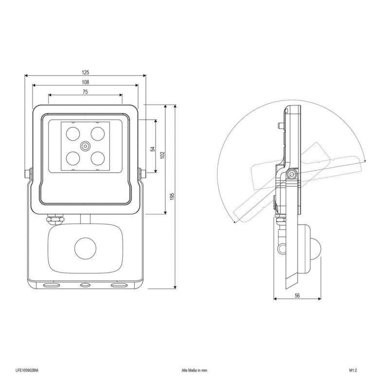 Širokopásmový LED vonkajší reflektor Panthera so súmrakom a snímačom pohybu pre pripojenie 230V, IP65, 3 000 K. LED vonkajšie bodové svetlo Panthera je energeticky úsporná alternatíva k veľkoplošným prácam s teplým bielym svetlom a bežnému osvetleniu vo vonkajších prevádzkach, skladoch a výrobných halách zameraná na dopyt. Zapína sa automaticky pomocou snímača pohybu a súmraku. Montážna konzola umožňuje vyrovnanie a upevnenie hlavice svetlometu k stropom, stenám, podlahám, plošinám a koľajniciam. Konštrukcia čierneho práškovo lakovaného hliníkového krytu, krytu z číreho skla a skrutiek z nehrdzavejúcej ocele zaujme svojou odolnosťou proti korózii a robustnosťou. – Prah súmraku, citlivosť a čas oneskorenia je možné nastaviť na senzore – 1 m pripojovací kábel s voľnými koncami drôtov – Odolný proti korózii podľa EN ISO 9227: 2012 – vrátane predradníka – Rozsah otáčania: 270 ° – Odolnosť proti nárazu: IK08 – Teplota okolia počas prevádzky: – 20 až + 45 ° C