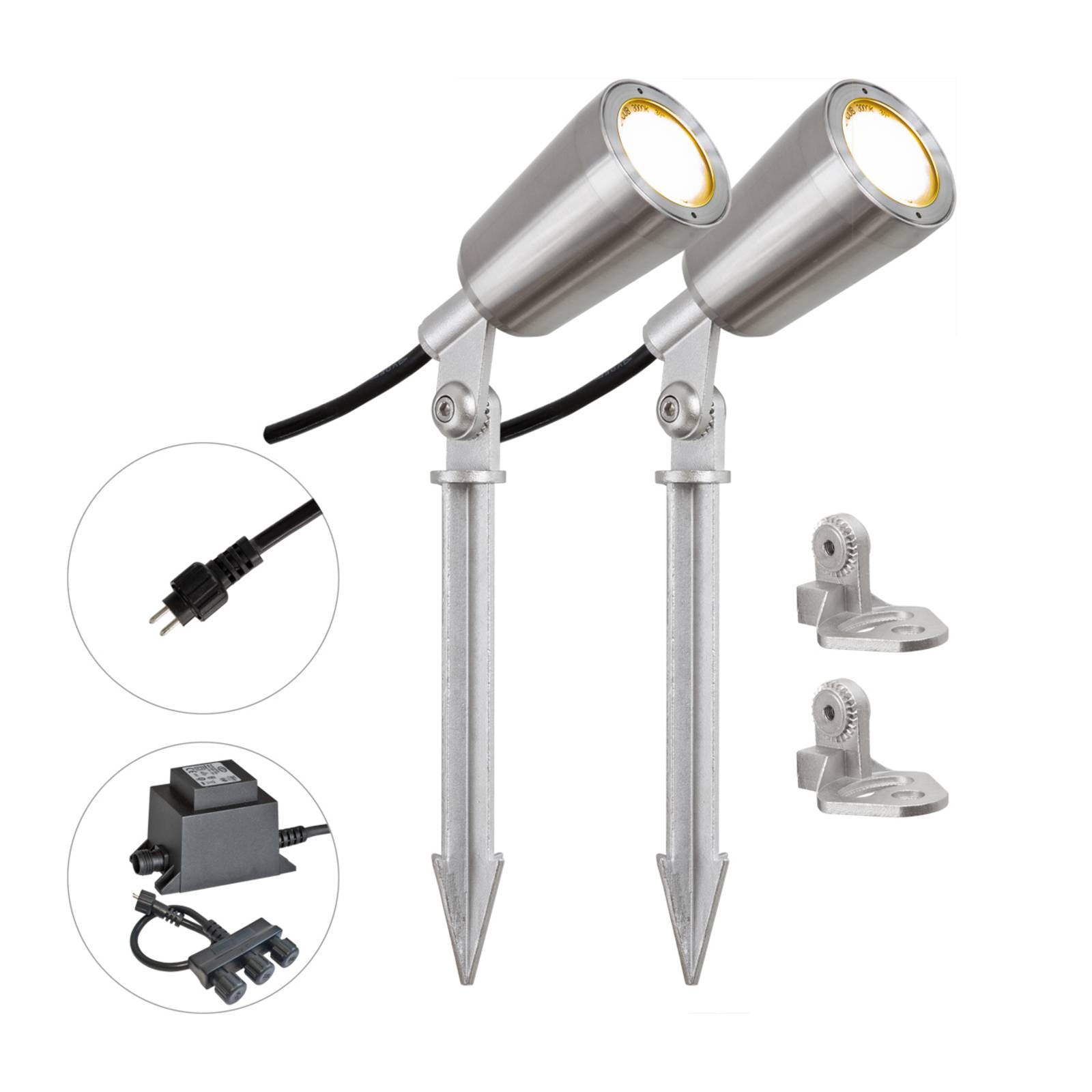 sada 2 ks s transformátorom a rozdeľovačom: Záhradný LED reflektor PC6806 z nehrdzavejúcej ocele so zásuvným systémom IP44, otočnýV tejto sade nájdete LED reflektor PC6806 dvakrát. Každý bod má 5 m dlhý pripojovací kábel pre zásuvný systém IP44 a dodáva sa s uzemňovacím hrotom aj montážnou základňou. Vďaka tomu sa dajú body namontovať rôznymi spôsobmi, buď priamo do zeme, alebo na kamennú dosku. Okrem toho sú miesta chránené proti trvalému ponoreniu až do hĺbky 1,5 metra. Dajú sa otáčať až o 60° a vysokokvalitné moduly LED sa inštalujú zo závodu. Súčasťou tejto sady je aj 3-cestný rozdeľovač a zodpovedajúci predradník s krytím IP44 s obrysovou zástrčkou, takže spoty možno priamo uviesť do prevádzky.Technické vlastnosti/charakteristiky- praktická sada 2 ks vrátane transformátora a 3-cestného rozdeľovača- s uzemňovacími hrotmi a montážnymi nožičkami- otočné- rozloženie svetla: symetrické- stredne široké rozloženie: 21° až 40°- trieda ochrany spotov: IP68 (chránené proti ponoreniu do hĺbky 1,5 m)- Napäťové spoty: 12 V (AC/DC)- Spoty s 5 m dlhými pripojovacími káblami pre zásuvný systém IP44