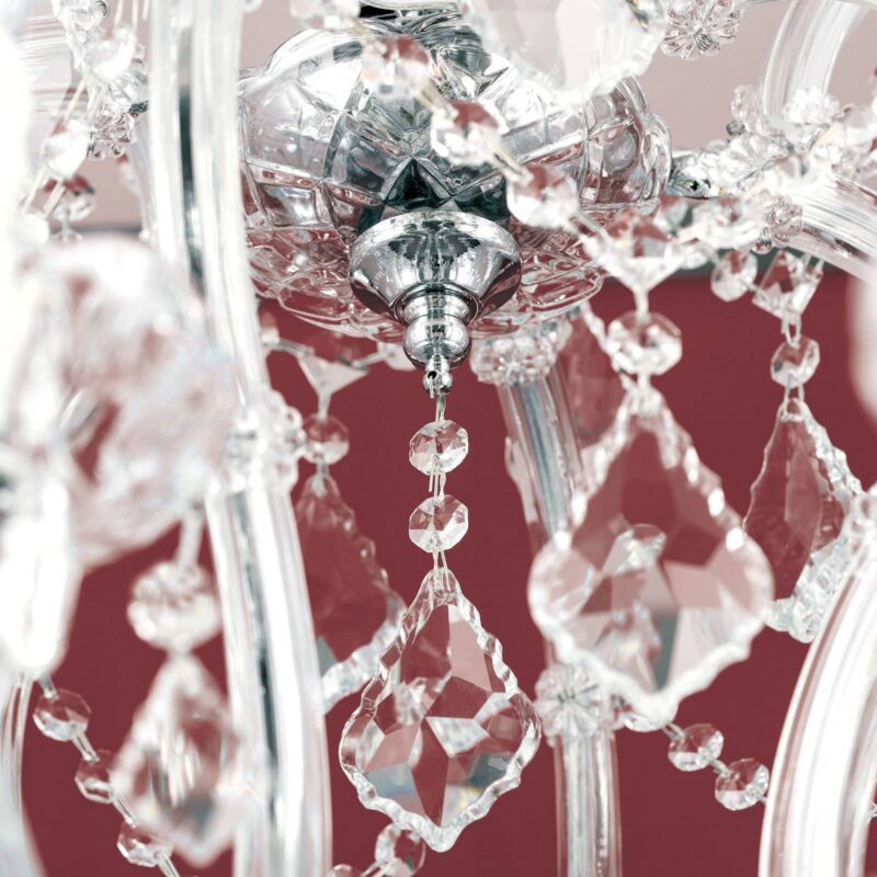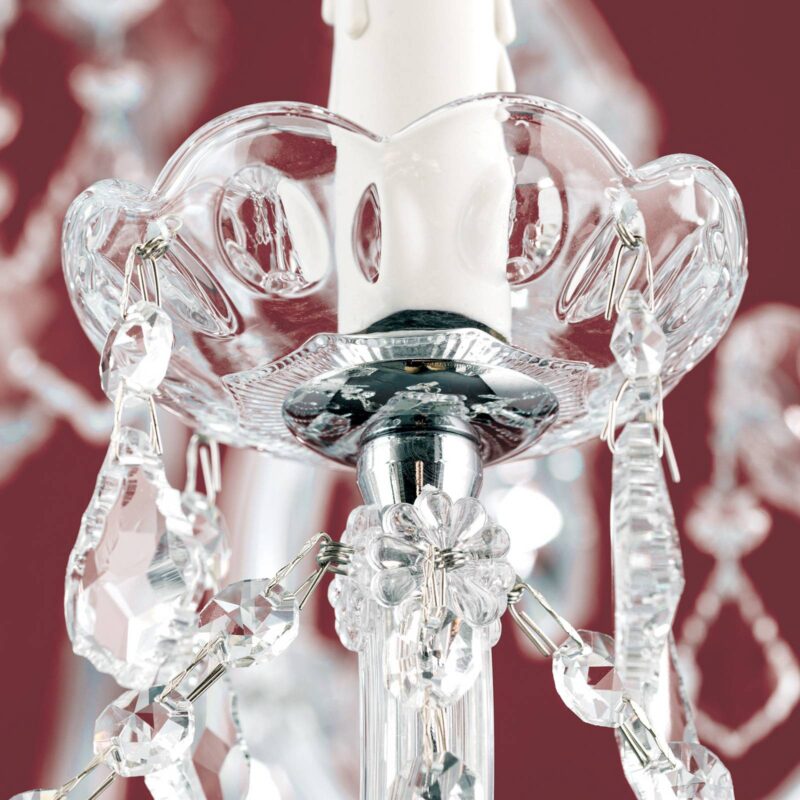 Excelentný luster LILIANA s krištáľmi Výnimočný luster LILIANA v štýle Márie Terézie s polobrúsenými visiacimi krištáľmi. Tento luster krásne ozdobí priestory každého typu a umožní dosiahnuť jedinečný nádych pôvabu. Žiarovky osadené v držiakoch na sviečky vyžarujú romantickú atmosféru a v kombinácii s krásnymi krištáľmi vytvárajú jedinečné svetelné odrazy. Ponorte sa do sveta baroka a užite si hodiny pohody v lesku tohto trblietavého svietidla.
