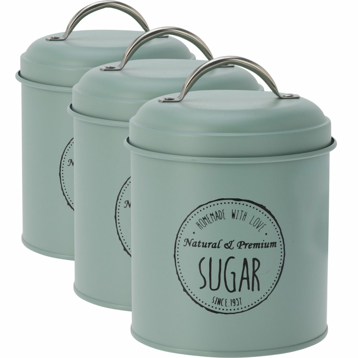 Dózy sú vyrobené z kvalitného kovu s práškovým lakovaním, ktoré zaisťuje odolnosť a dlhú životnosť. Vďaka dobre tesniacim viečkam zostávajú uskladnené suroviny chránené pred vlhkosťou, prachom a stratou arómy. Každá nádoba je vybavená praktickým kovovým úchytom, ktorý uľahčuje otváranie a zároveň podčiarkuje retro vzhľad celej sady. Hmotnosť jednej dózy je 235 g.