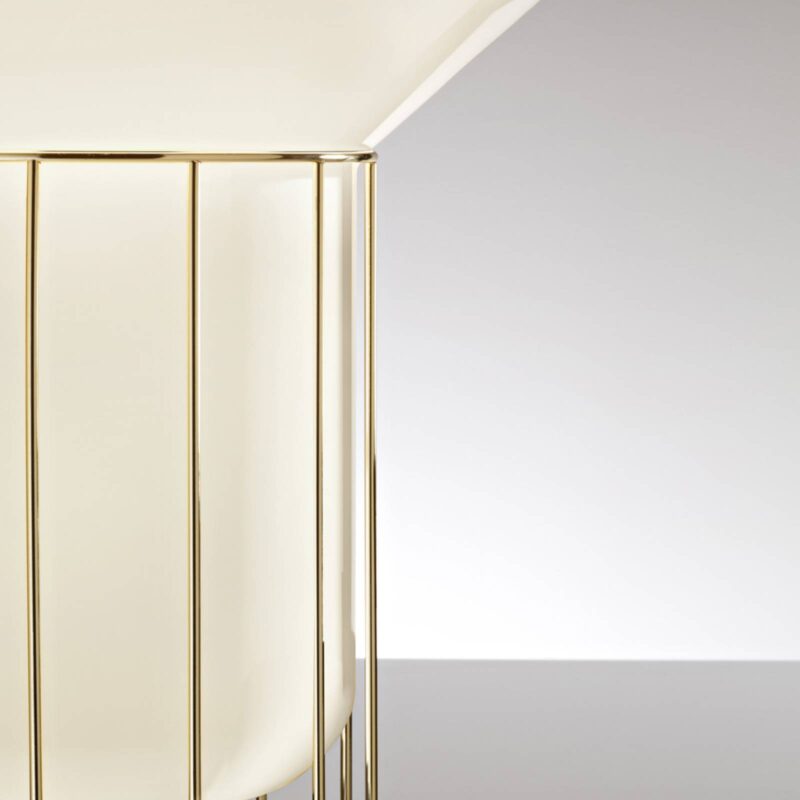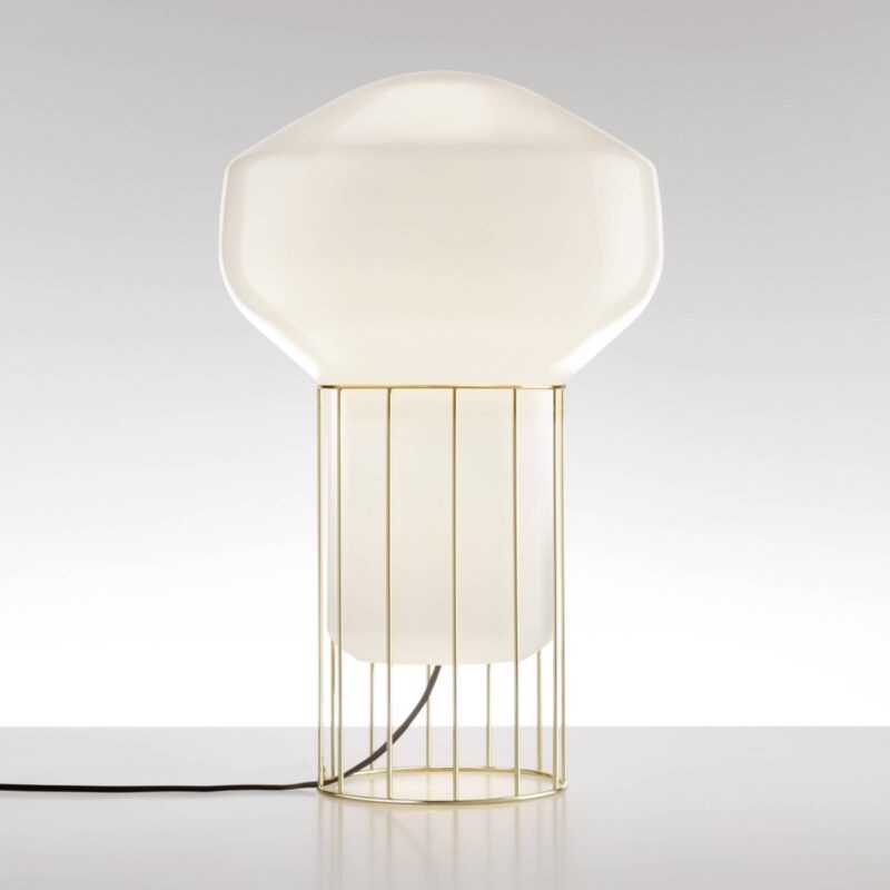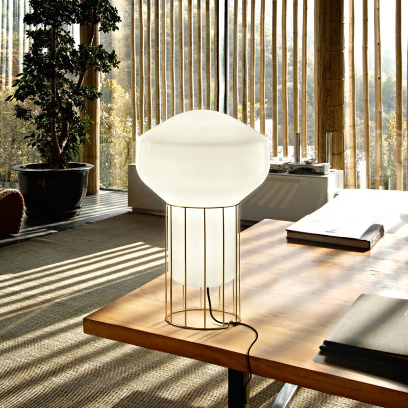 Stolová lampa Aérostat s tienidlom z fúkaného sklaDizajnová stolová lampa Aérostat od talianskeho výrobcu svietidiel Fabbian vyžaruje určitú ľahkosť a jednoduchosť. Za túto ľahkosť je určite zodpovedné lesklé biele tienidlo z fúkaného skla. V kontraste s okrúhlym tienidlom je rovný kovový rám, ktorého jemné tyče sú potiahnuté mosadzou a krásne sa lesknú. Stolnú lampu Aérostat navrhol Guillaume Delvigne a pochádza z dielne talianskej spoločnosti Fabbian, ktorá od roku 1961 vyrába v Trevise vysokokvalitné svietidlá, ktoré inšpirujú vynikajúcim spracovaním a jedinečným dizajnom.