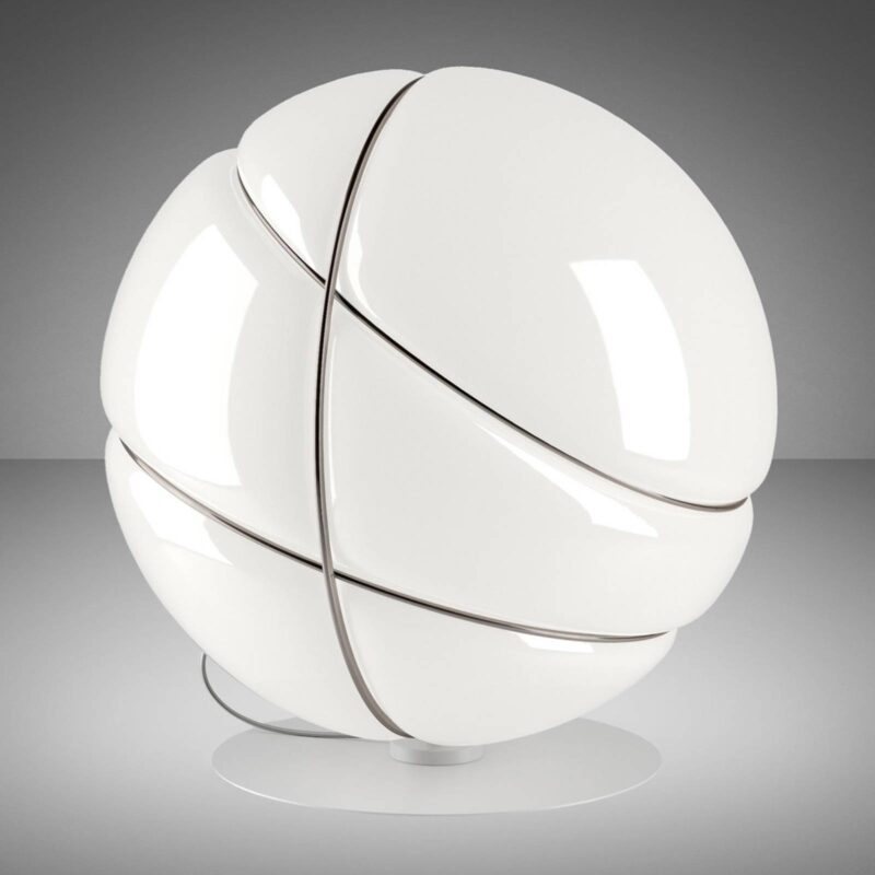 Stolová lampa Armilla – biela guľovitá guľa vyrobená zo skla Stolová lampa Armilla vyrezáva vynikajúcu postavu ako dekoratívny svetelný prízvuk pre súkromné a verejné salóniky. Na diskrétnom okrúhlom podstavci je umiestnený okrúhly tienidlo na lampu , ktorému dizajnér Lorenzo Truant ako zvláštnosť dal tri úzke prstene vyrobené z lešteného kovu, ktorých lesk úžasne harmonizuje s hladkým povrchom bieleho skla. Lampa je vyrobená pre výrobcu Fabbian v Taliansku. Kovové krúžky sú opatrne vložené do ručne fúkaného, ešte horúceho a viskózneho skla, aby sa dosiahla ich zapustená poloha.