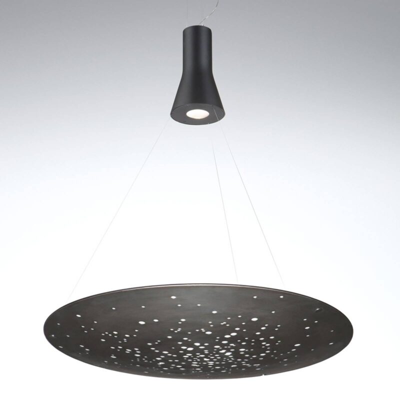 Funkčne fantastická dizajnová závesná LED lampa LensTáto závesná lampa spája očarujúci vzhľad série Lens z pera českej dizajnérky Lucie Koldovej s vysokou funkčnosťou. Reflektor LED vrhá svetlo na šošovkovito zakrivený kovový disk s množstvom otvorov rôznych veľkostí, ktorý vytvára pôsobivú hru svetla a tmy. Jedinečná povrchová úprava je výsledkom zložitého remeselného procesu. Výsledkom je efektný pútač pohľadov, ktorý sa hodí najmä do mnohých luxusných obytných priestorov a vďaka možnosti stmievania (vhodným spínačom) sa dá prispôsobiť atmosfére podľa individuálnych želaní.