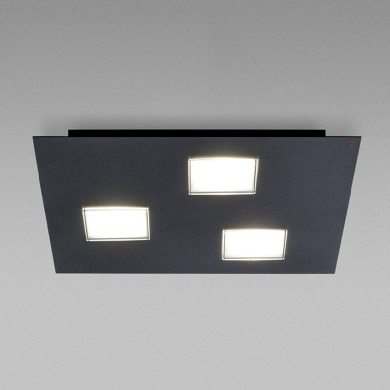 Moderné stropné svietidlo LED Quarter v čiernej farbe s tromi svetelnými výstupmiČierny lak štvorcovej dosky robí zo stropného svietidla Quarter ideálny zdroj svetla na zabezpečenie hlavného osvetlenia moderne zariadených obývacích izieb a chodieb. Za tromi štvorcovými vývodmi svetla, ktoré boli zakryté difúzorom z polykarbonátu, svieti v každom prípade 4,5 W LED dióda. Tri LED diódy spolu dosahujú svetelný tok 1 200 lúmenov. Dajú sa stmievať pomocou stmievača s fázovou alebo fázovou redukciou, takže sa dá dosiahnuť aj jemné osvetlenie pozadia – napríklad v obývacej izbe pri sledovaní televízie. Stmievač nie je súčasťou dodávky. stropné svietidlo Quarter LED vyrobené v Taliansku renomovaným výrobcom Fabbian Illuminazione sa vyznačuje prvotriednou kvalitou a jednoduchým dizajnom. Výrobky tohto talianskeho výrobcu sa tešia veľkej obľube po celom svete.